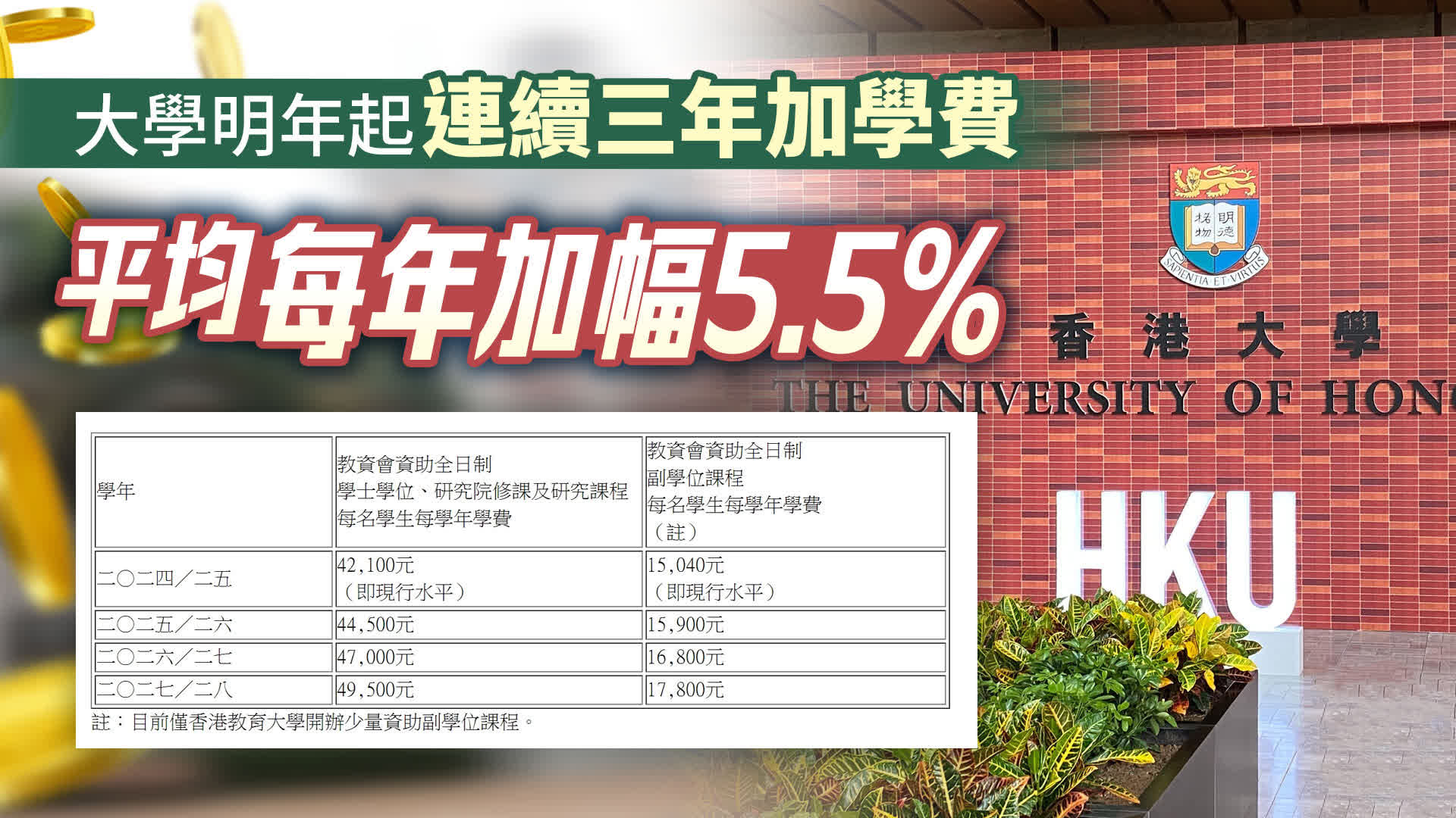 政府今日(20日)公布了大學教育資助委員會(教資會)資助本港8所大學公帑資助課程在2025/26至2027/28學年的學費水平,稱「考慮各項因素後,政府決定教資會資助課程的學費水平,將以平均每年5.5%的溫和幅度調整」,而「2024/25學年的學費,仍將維持不變,以讓社會有更長時間作出適應及準備」。