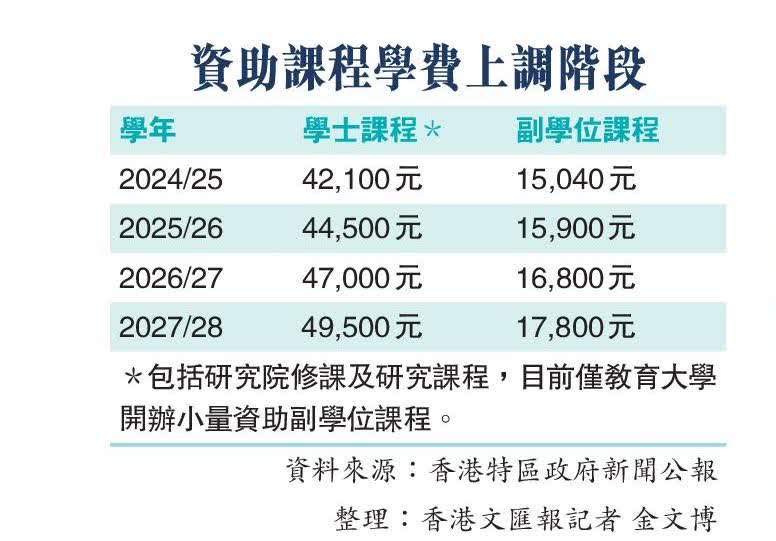 (香港文匯報 記者 金文博)香港8所資助大學的本地生學費27年來首次調整,特區政府經仔細研究後,昨日公布將於2025/26學年起連續3年增加學費,平均每年加幅5.5%,學士及研究院課程將由現時的42,100元增加至2027/28學年的49,500元;副學位課程則由15,040元上調至17,800元。至於2024/25學年學費會凍結,讓社會有更長時間消化及作好準備。為此政府為修讀全日制大專學生提供的資助專上課程學生資助計劃和全日制大專學生免入息審查貸款計劃之學費助學金和貸款額亦會在相關學年起相應調整。特區政府政務司司長陳國基表示,這次加幅溫和,學生能負擔得起,政府會向有需要學生提供支援,希望令同學在讀書方面沒有任何壓力,暫時目標只是加費3年,「3年後,我們暫時還未計劃加學費。」