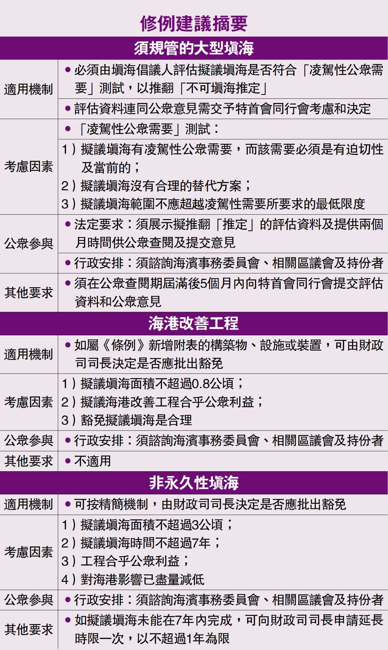 經公眾諮詢後,發展局調整部分修例建議,包括建議把規範「大型填海」的機制寫入《條例》,包括要求評估擬議填海是否符合「凌駕性公眾需要」測試,以推翻「不可填海推定」,以及賦權行政長官會同行政會議決定是否信納的權力。