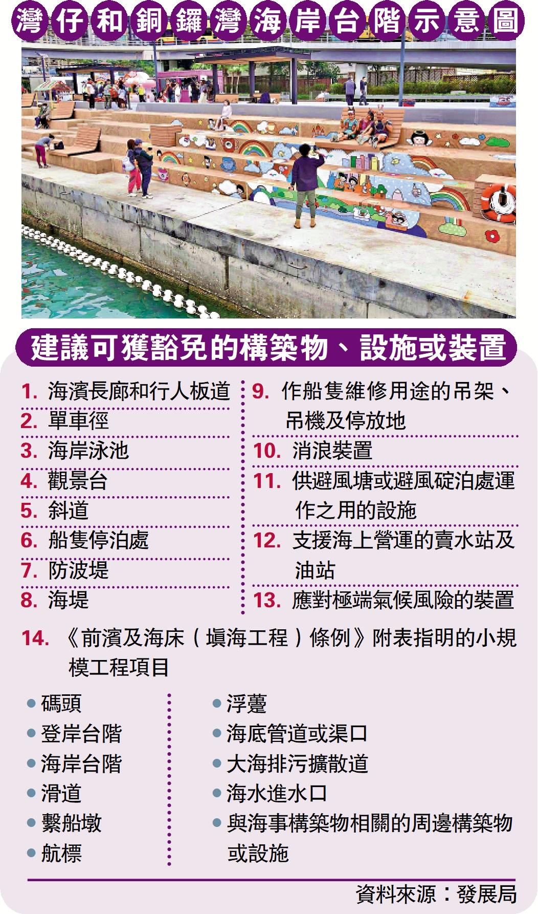 發展局最新提交立法會文件表示,條例修訂草案會在年內提交立法會,並預期若修例通過,多項擬議海濱工程,包括堅彌地城新海旁行人板道、將灣仔和銅鑼灣海岸台階延伸至水體等項目,可望受惠。