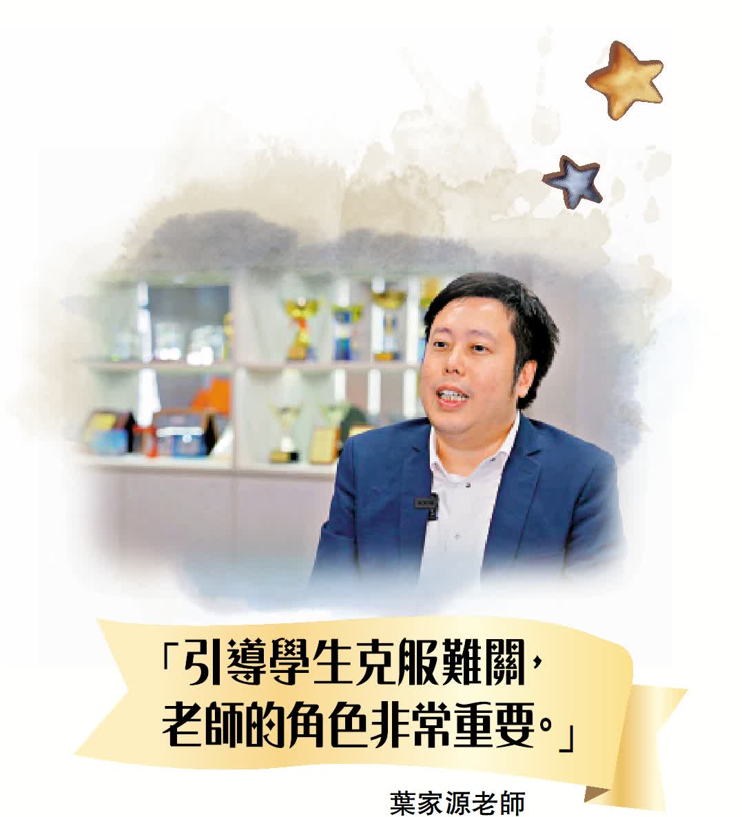 葉老師說,要引導學生克服難關,老師的角色非常重要。作為老師除了要仔細聆聽他們的煩惱,亦要因材施教為不同學生提供適合的引導,例如對於學業成績未達理想的學生,先定下學業上的小目標及適合他的溫習時間表;在學生遇到家庭的難題時則透過心理輔導及與其家長溝通協調,更重要是鼓勵他們朝着自己的優點發展,發掘學生的潛能,從而提升他們的自信心,向自己的夢想前進。