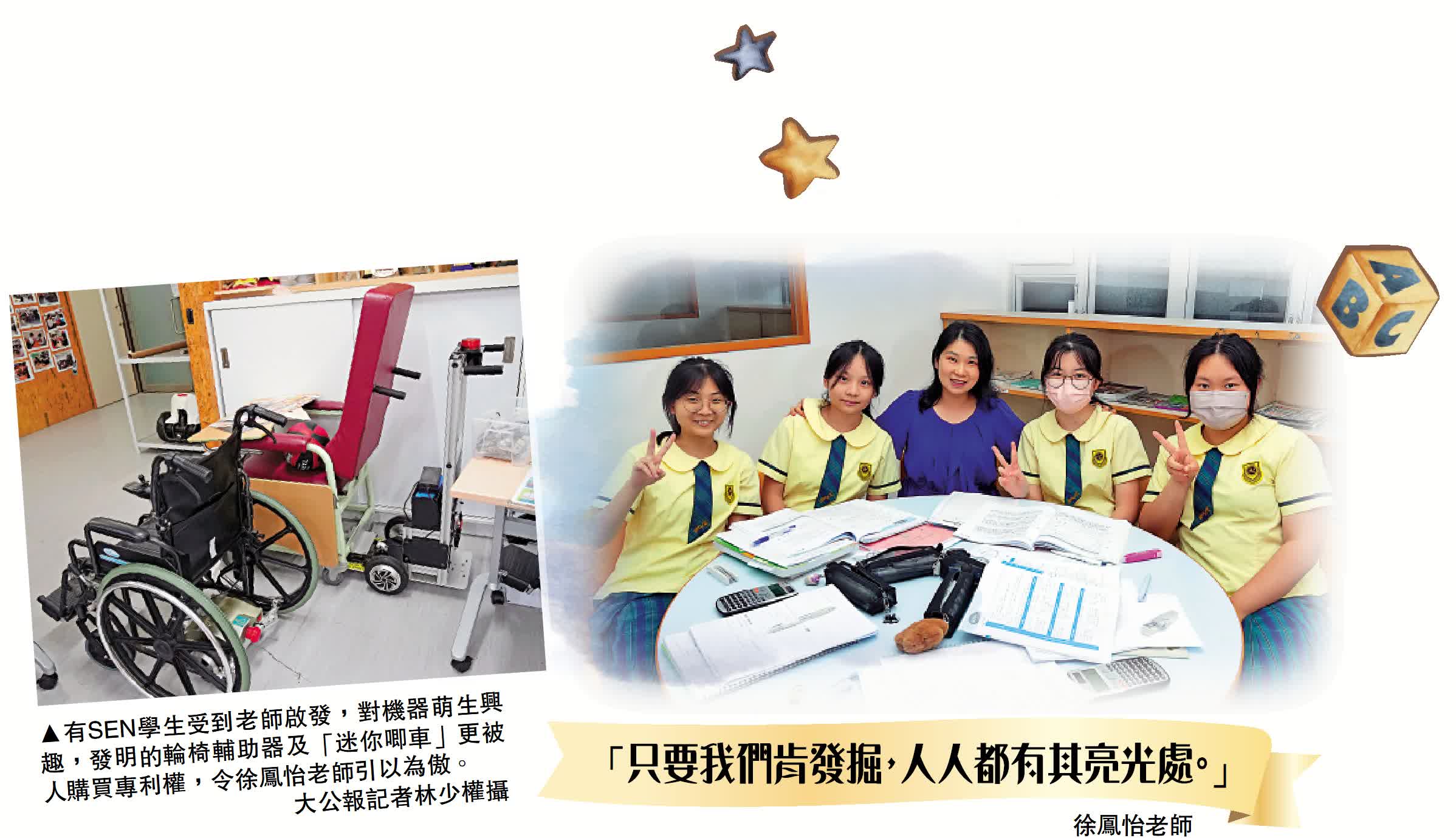 「透過跨學科合作,學生藉在STEM(科學、技術、工程及數學)知識層面,把冰冷的科技知識融入人情味,關顧到身邊有需要的人。」徐鳳怡看着學生的傑作,露出欣慰自豪的笑容。她還透露有一個SEN(特殊教育需要)學生,雖然學業成績並不突出,但當啟發了他對機器及發明的興趣,「開了竅」的他解說作品「有紋有路」,善用創作能力,化成對社會有用的工具,「當中輪椅輔助器及『迷你唧車』更被人購買專利權,收益可用作升讀大學的學費。」