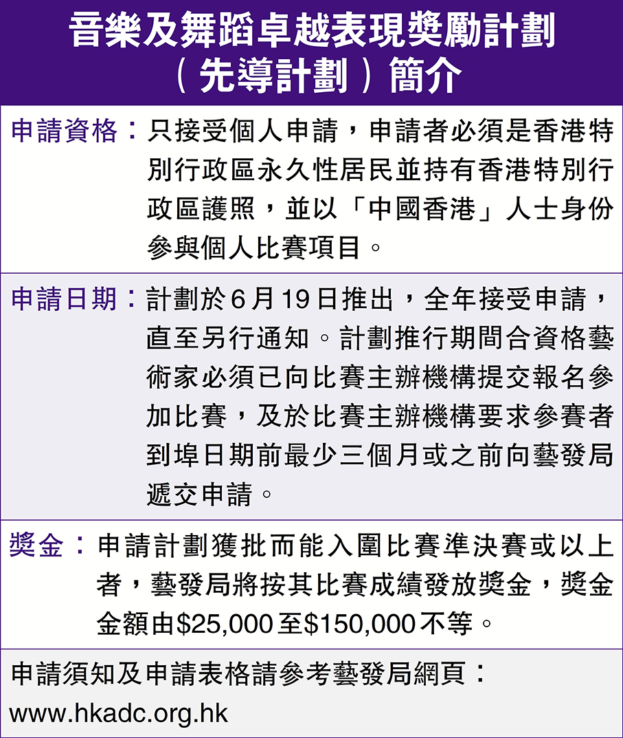 據了解,計劃獲得文化體育及旅遊局藝術及體育發展基金撥款支持,以先導形式試行三年。合資格申請者參與獲核准比賽並取得入圍準決賽或以上成績,藝發局將根據其比賽成績發放獎金。除此之外,還將為獲獎藝術家進行宣傳,表揚其卓越成就之餘亦助其拓寬職業道路。