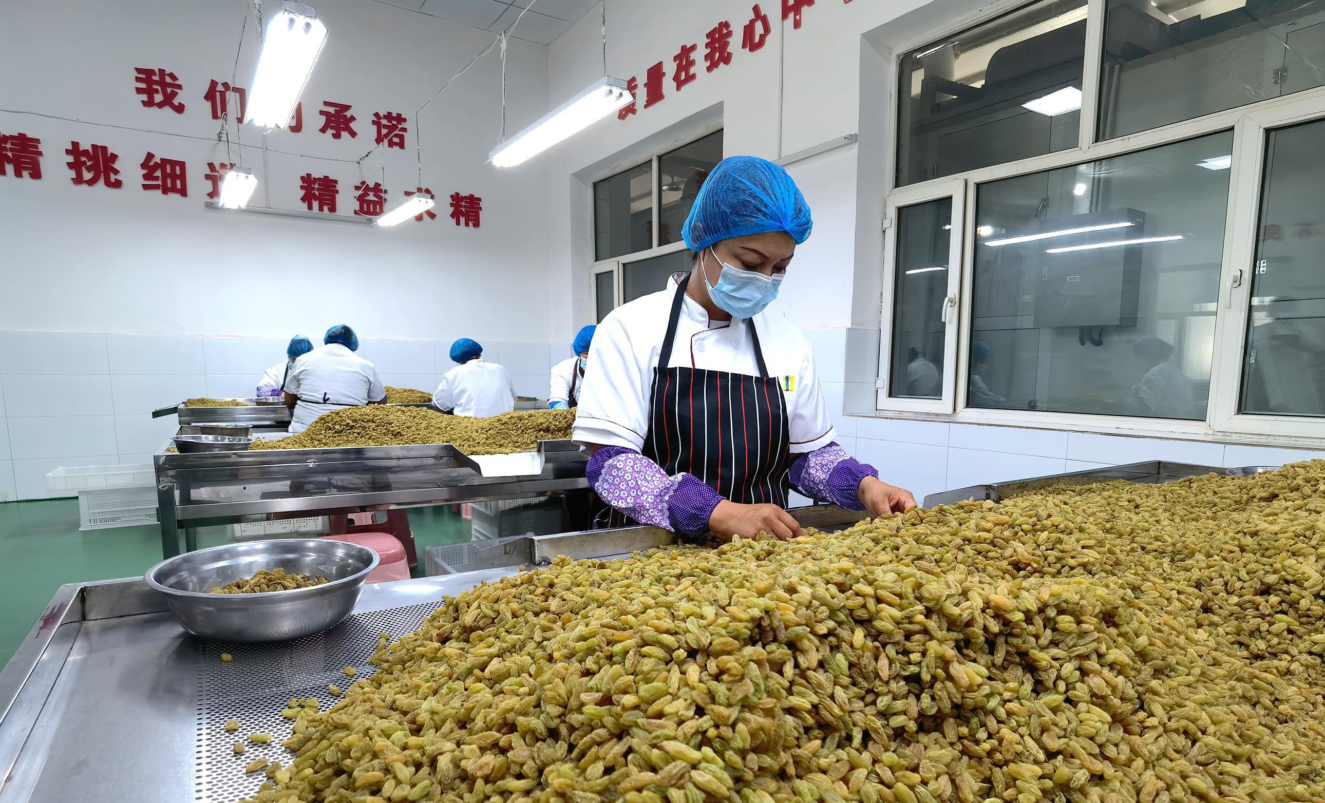 總書記走進廠房。篩選區,村民們靈巧地將葡萄乾篩出優劣。葡萄乾裝箱待發,即將運往大江南北。同總書記交談時,談到未來的日子,大家眼裏充滿希望。