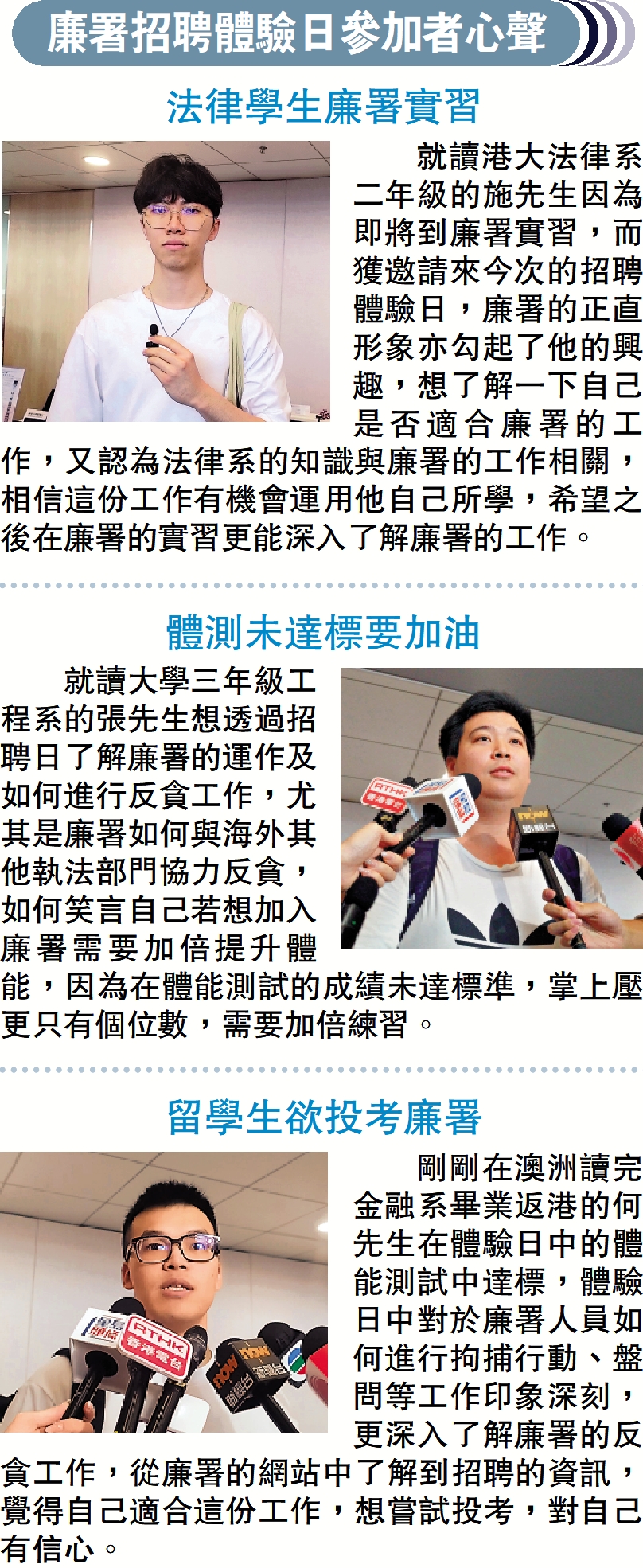 有志投身廉政工作的參加者,可即場接受入職體能測試,如通過體能測試,已等同合乎今年招聘的體能要求,新一輪目標是聘請到約30名調查主任及助理調查主任。有剛剛大學畢業的參加者在體驗日的體能測試中達標,對廉署的反貪工作感興趣便第一時間到來報名投考,對自己有信心。