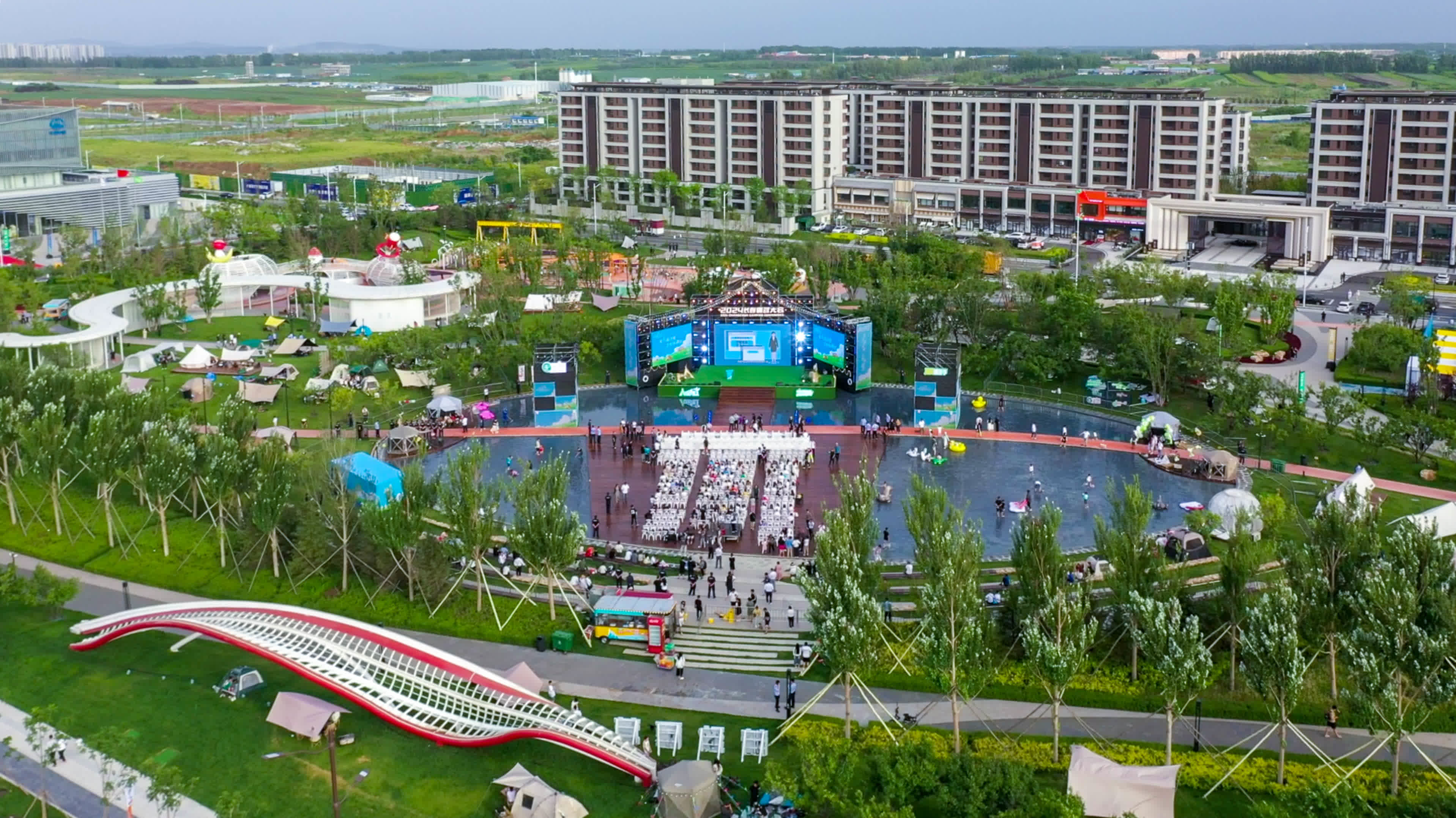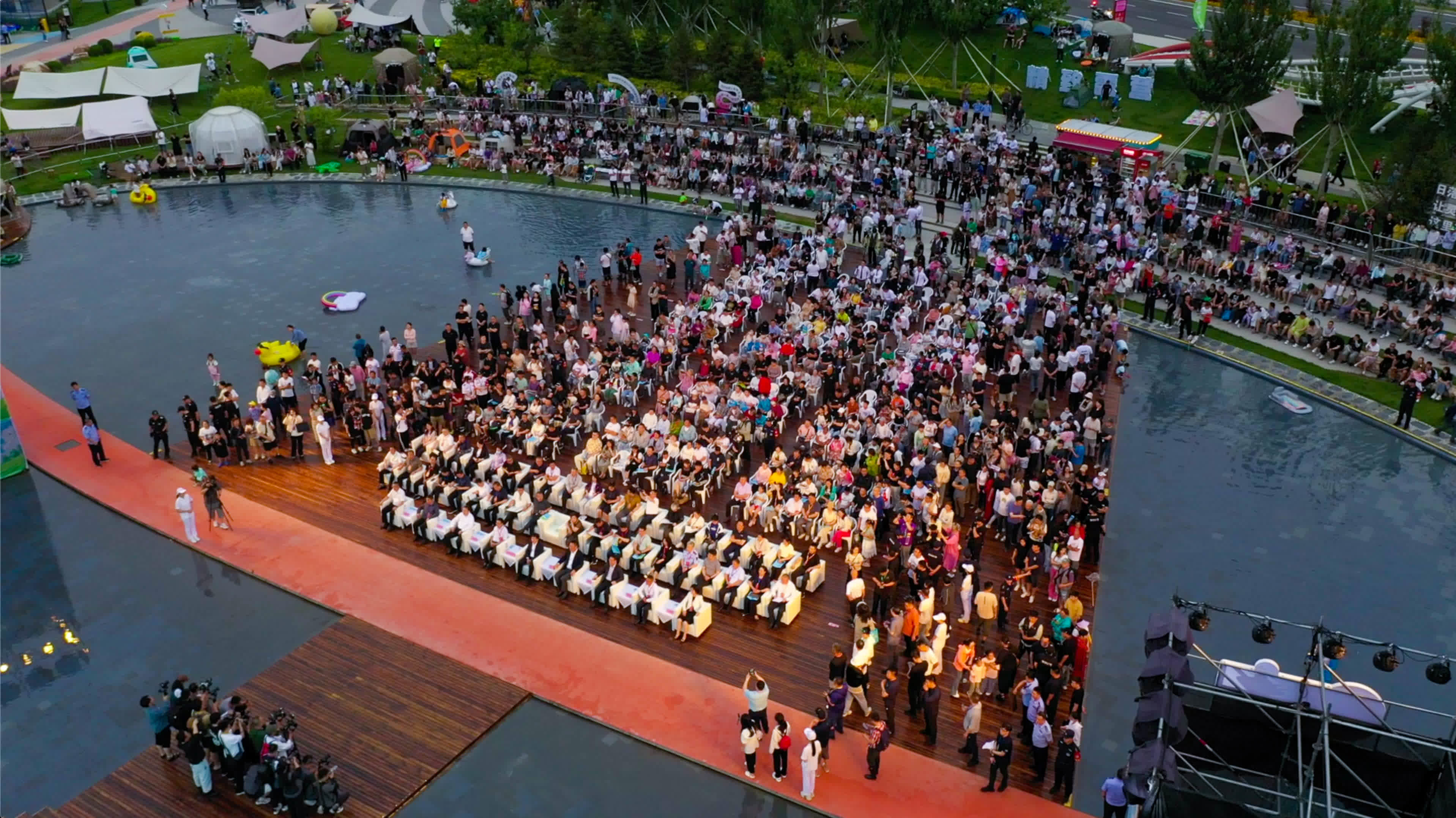 隨着領導和嘉賓們共同啟動2024清爽露營季,現場的氣氛達到了高潮。水上舞台上精彩的演出吸引了眾多觀眾的目光,而周邊的房車營地、精緻營地和自助營地更是人氣爆棚。文創市集區、無人機表演、樂隊演出、露天電影等豐富多彩的文體娛樂項目讓現場氣氛持續升溫。市民和遊客們在這裏搭建帳篷,享受戶外燒烤,參與各種趣味互動遊戲,盡情體驗露營的樂趣。
