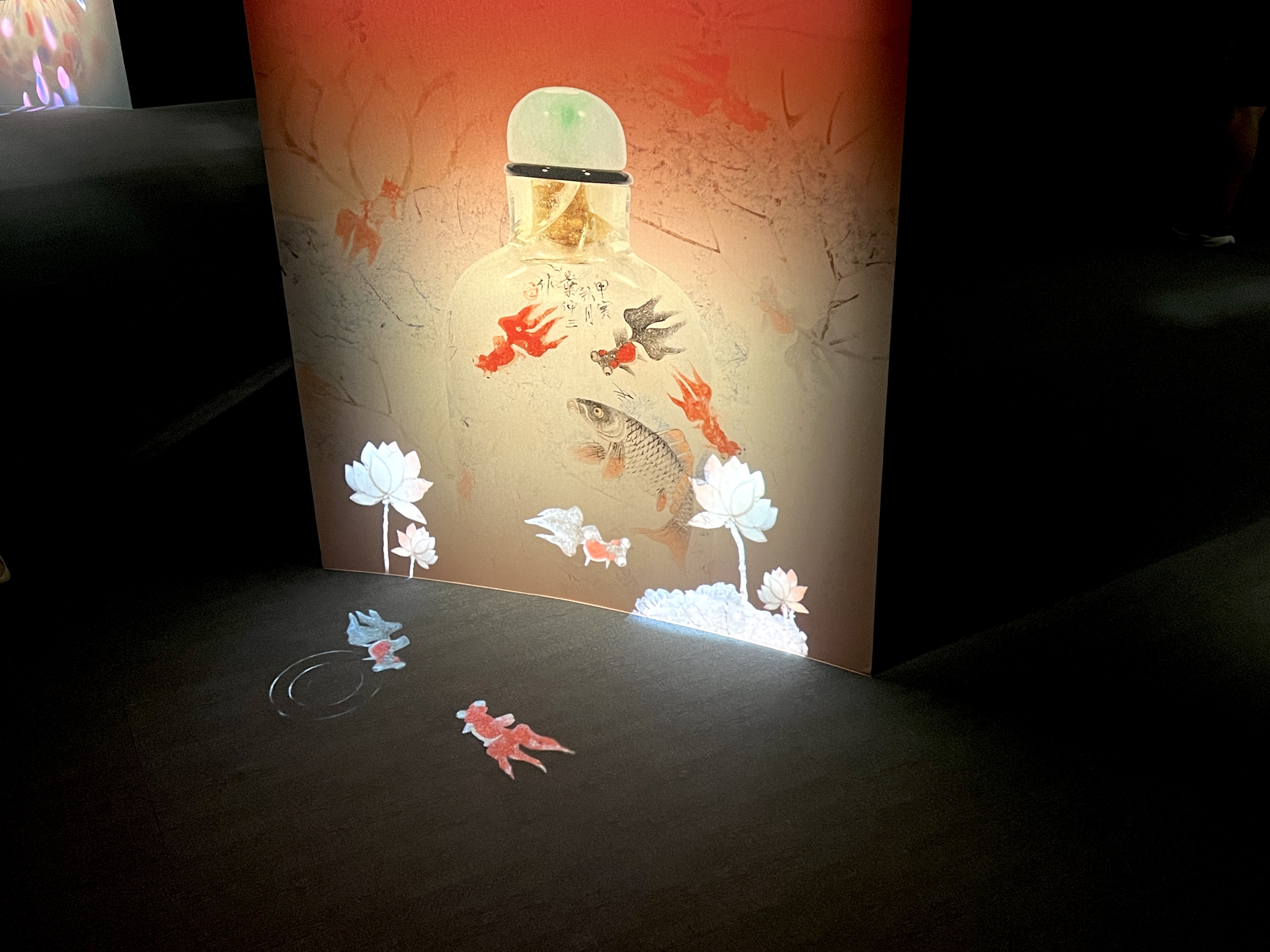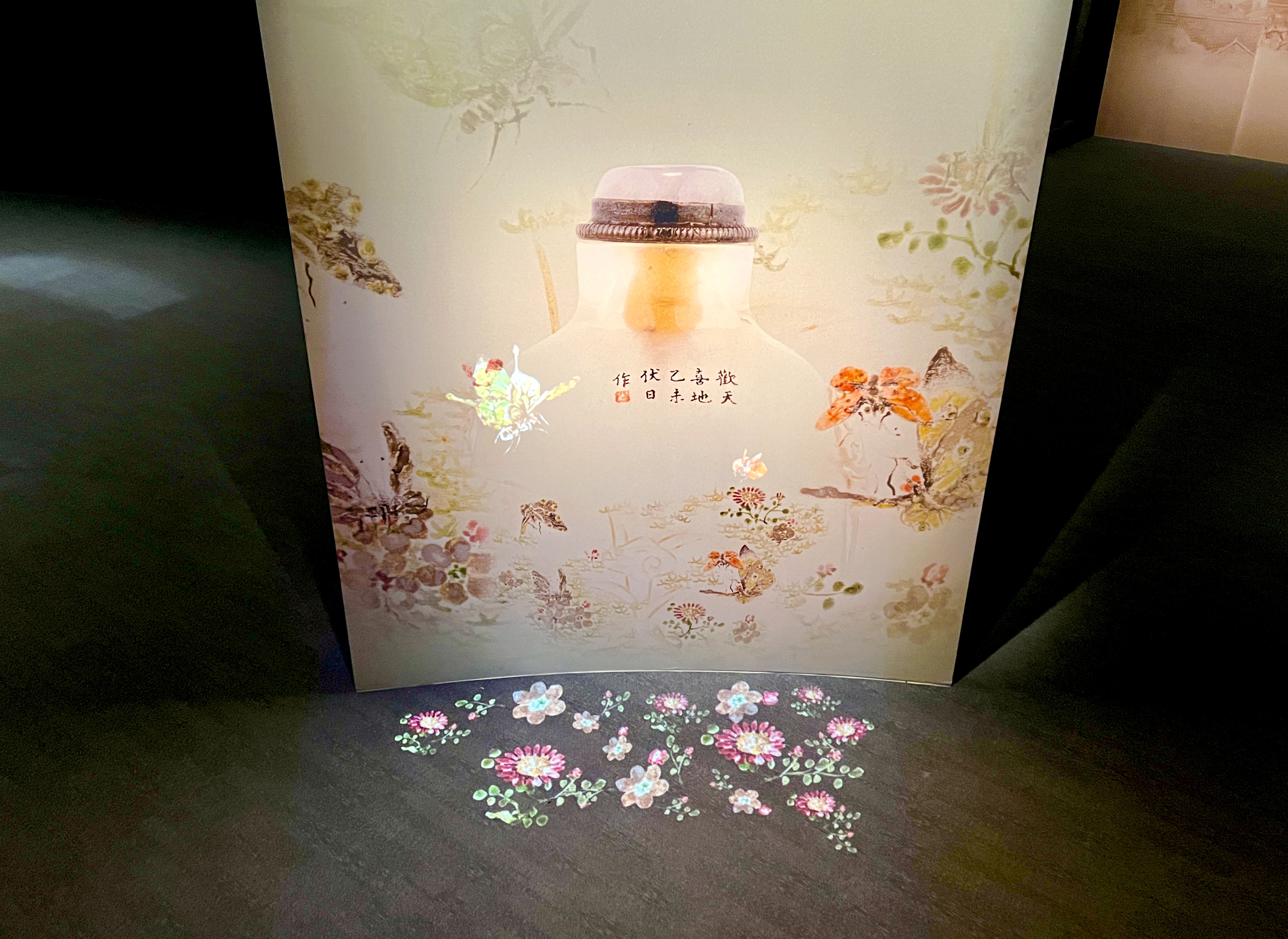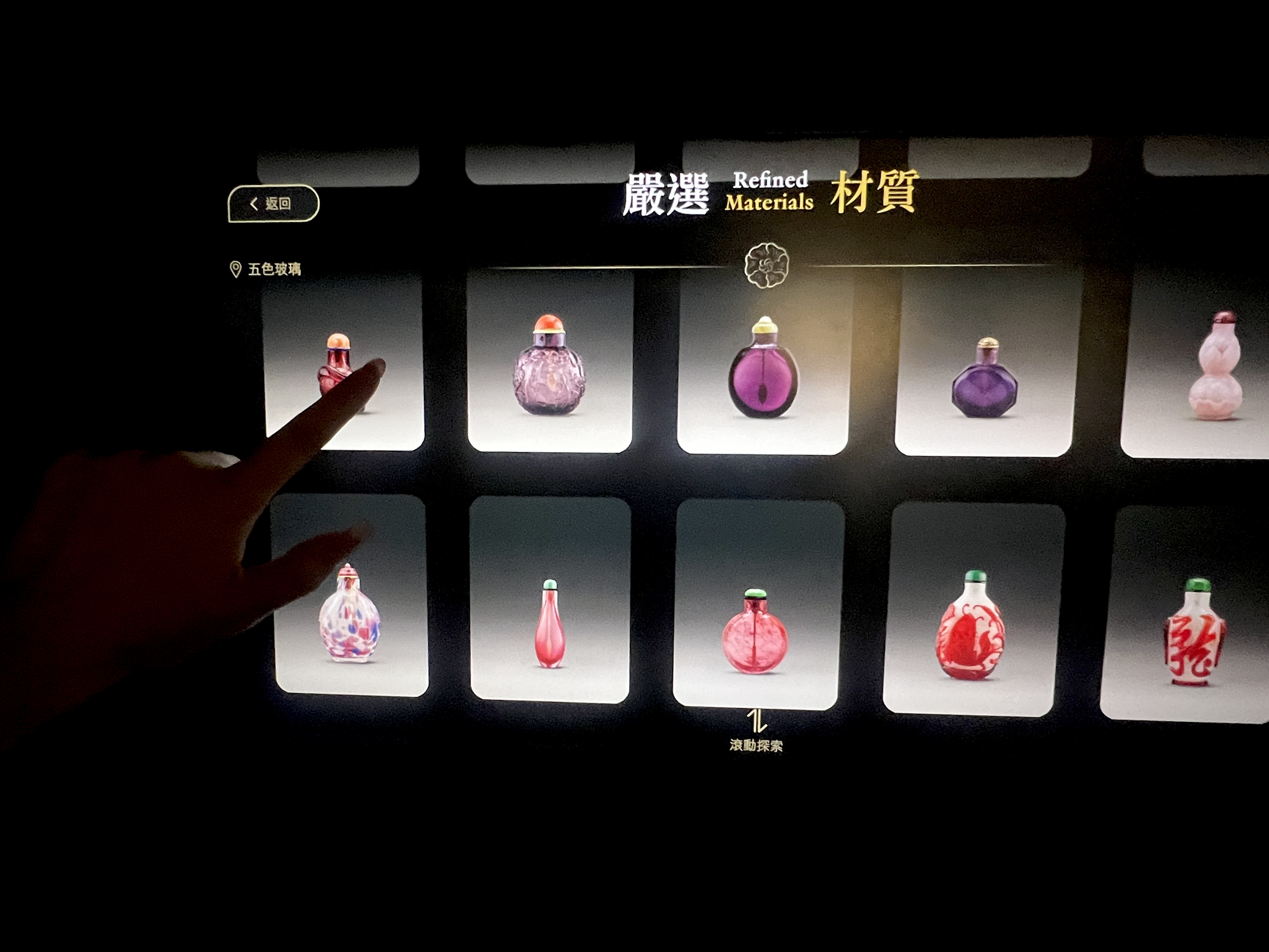 除了在鼻煙壺的擺放和打光上花心思之外,藝術館展示展品的巧思還有與觀眾互動,通過多媒體技術讓文物靈動起來。