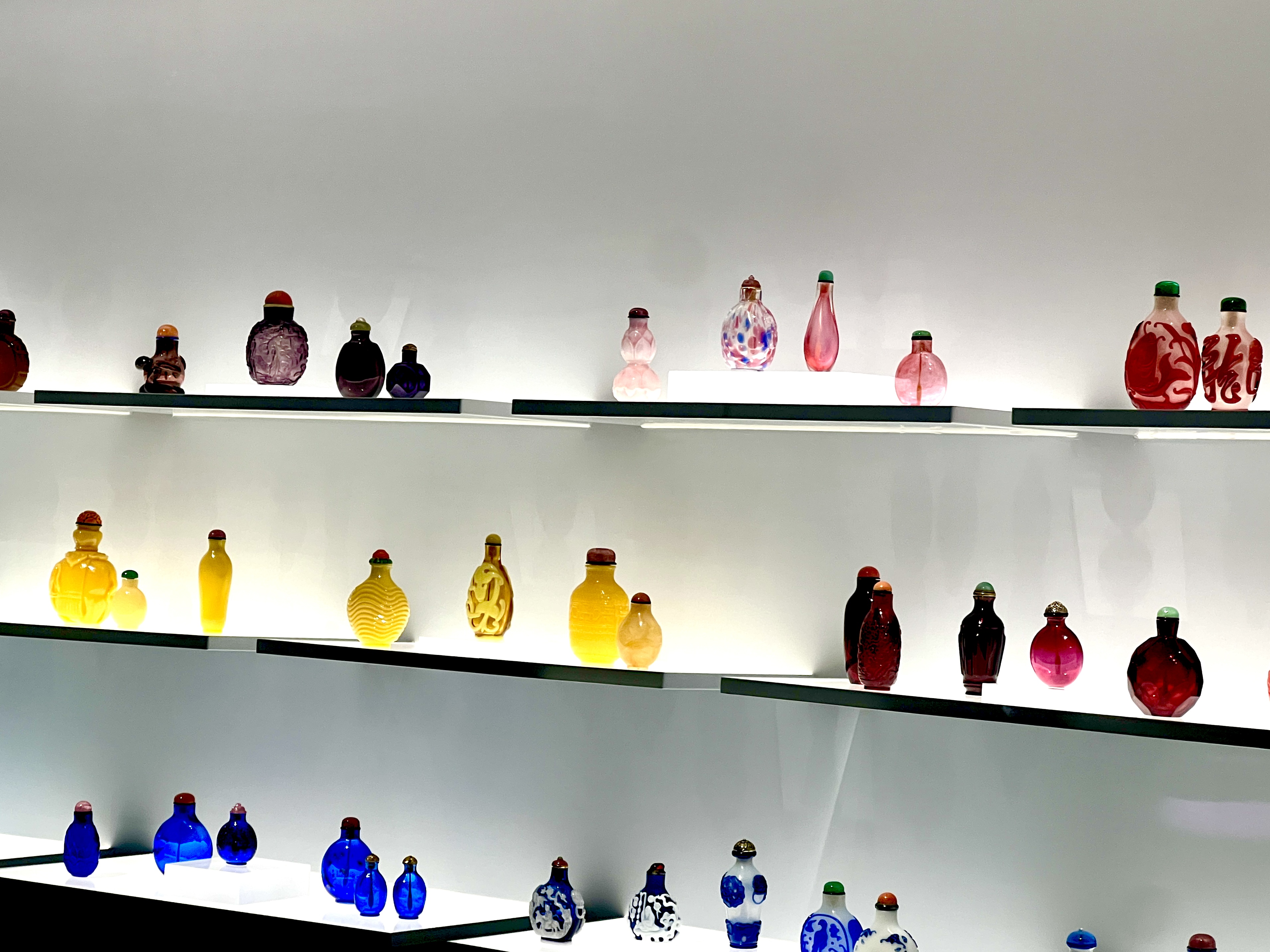 團隊在合作下,構思出許多展示展品的巧思。比如,剛到展廳門口,觀眾就會見到兩個投影將鼻煙壺放大數倍,這是想讓大家細看鼻煙壺的不同材質及紋路,欣賞到許多正常觀賞距離下無法捕捉到的細節。而走進展廳看到的第一個展櫃,更是構思最久的一個部分,它在布置上的別出心裁體現在展品是以顏色來分類。玻璃展櫃放這麼多件展品通常要很長,但團隊想讓這批展品在一進門就能見到的位置,所以將展品按顏色分類,分層擺放在展櫃中。