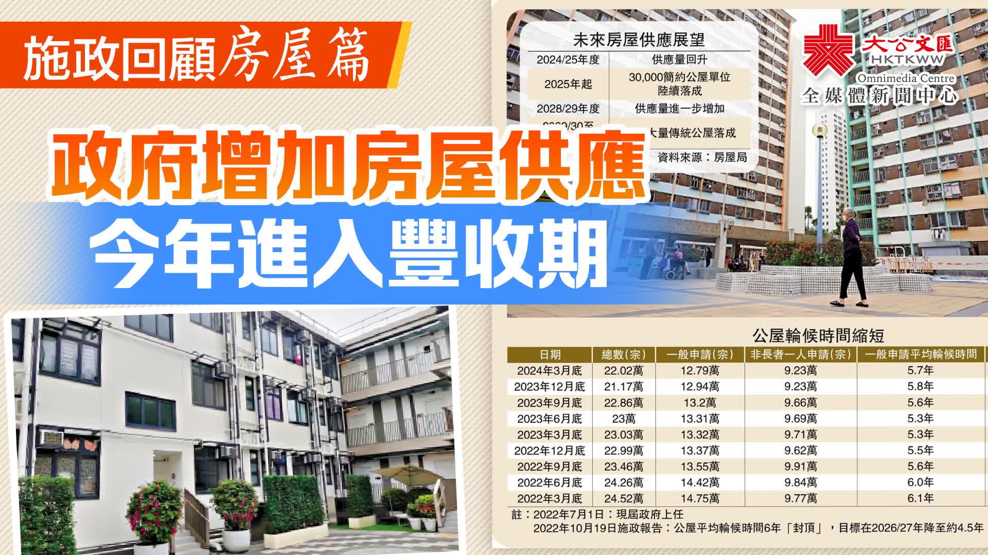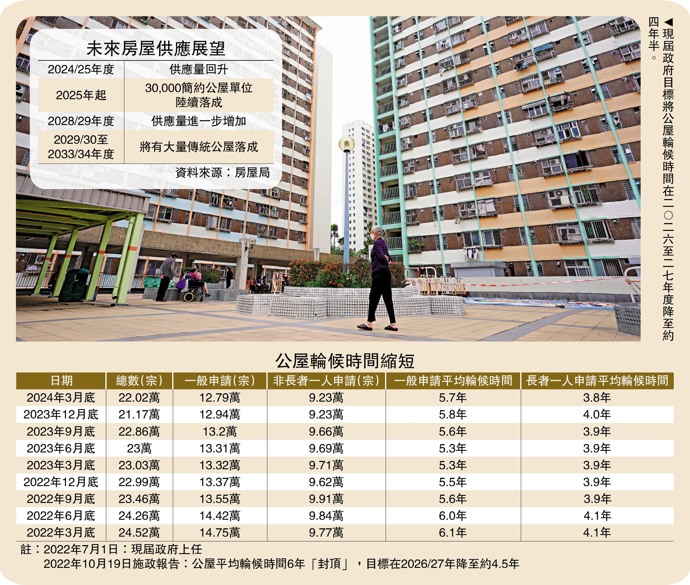 公屋輪候時間早年曾持續攀升,最高曾升至6.1年,現屆政府在2022年上任後首份施政報告中提出,為當時約6年的輪候公屋時間即時「封頂」,目標是結合簡約公屋和傳統公屋總供應量,將綜合公屋輪候時間在2026/27年度降至約4.5年。