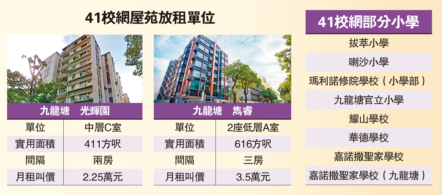 余成偉續說,41校網是香港數一數二的豪宅地段,以豪宅洋房及大型單位為主,對於中產小家庭來說,可以揀選入場門檻較低的廣播道舊式屋苑,例如廣播道光輝園中層C室,實用面積411方呎,為兩房間隔,連一個車位,每月租金叫價2.25萬元,實用呎租54.7元,惟要留意的是,屋苑早於1976年入伙,樓齡已達48年。