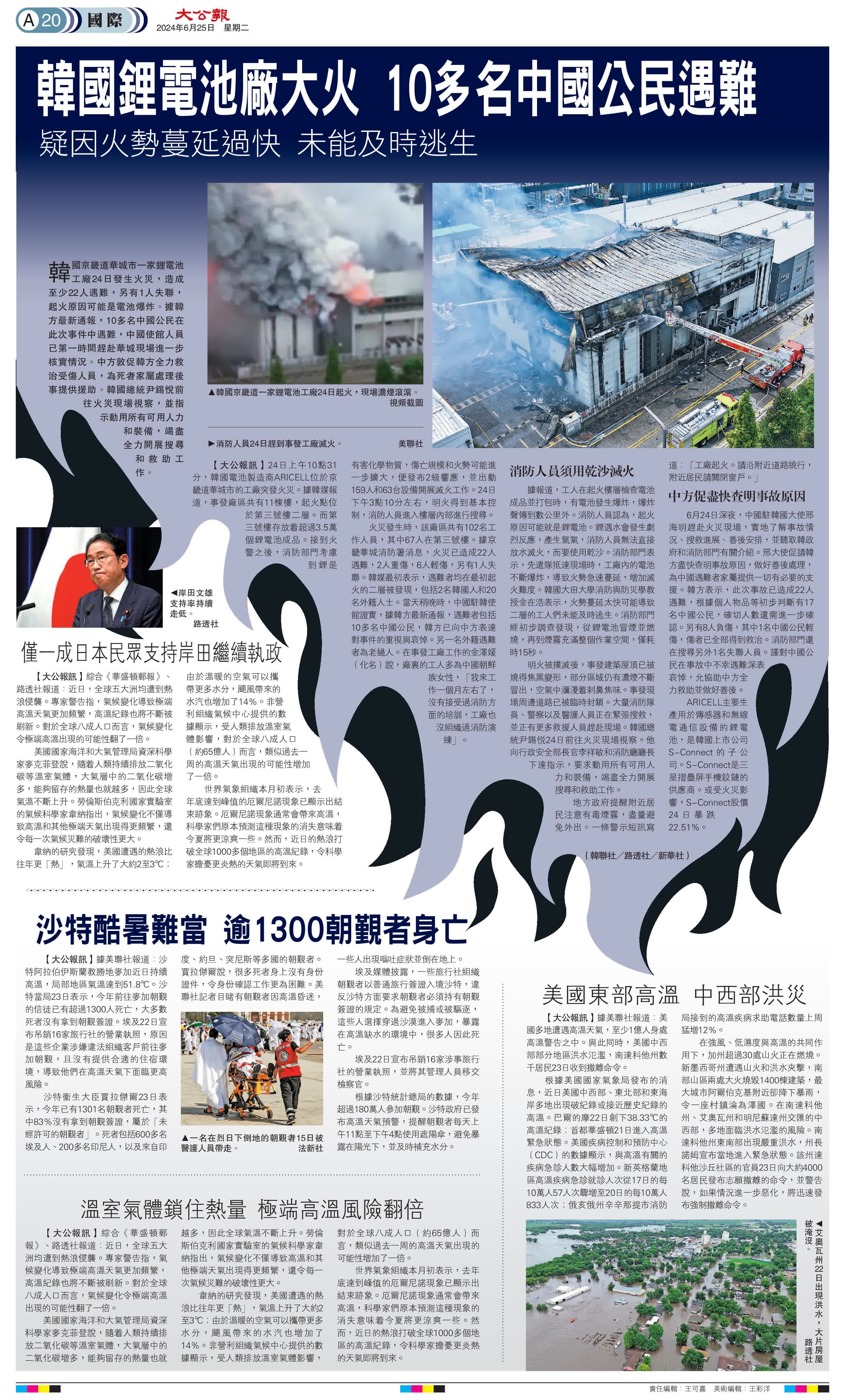 大公報綜合報道,韓國京畿道華城市一家鋰電池工廠24日發生火災,造成至少22人遇難,另有1人失聯,起火原因可能是電池爆炸。據韓方最新通報,10多名中國公民在此次事件中遇難,中國使館人員已第一時間趕赴華城現場進一步核實情況。中方敦促韓方全力救治受傷人員,為死者家屬處理後事提供援助。韓國總統尹錫悅前往火災現場視察,並指示動用所有可用人力和裝備,竭盡全力開展搜尋和救助工作。
