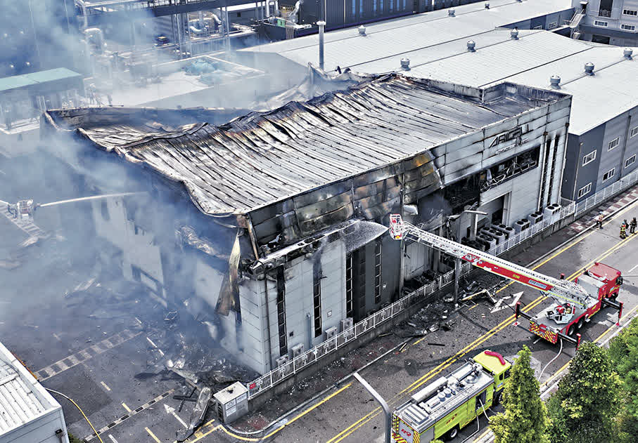 據韓國時報報道,在火災持續四個多小時後,火勢才被控制住,因為使用常規滅火方法很難撲滅燃燒的鋰電池,消防員在滅火過程中遇到了巨大的挑戰。