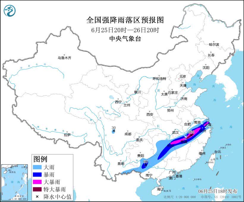 中央氣象台預計,6月25日20時至26日20時,蘇皖南部、上海、浙江西部和北部、江西中北部、湖南中部、廣西西部和北部等地部分地區有暴雨,其中,安徽南部、湖南東部、江西北部、浙江西部和北部、上海等地部分地區有大暴雨,江西北部局地特大暴雨(250~260毫米)。上述部分地區伴有短時強降水(最大小時降雨量30~50毫米,局地可超過60毫米),局地有雷暴大風等強對流天氣。
