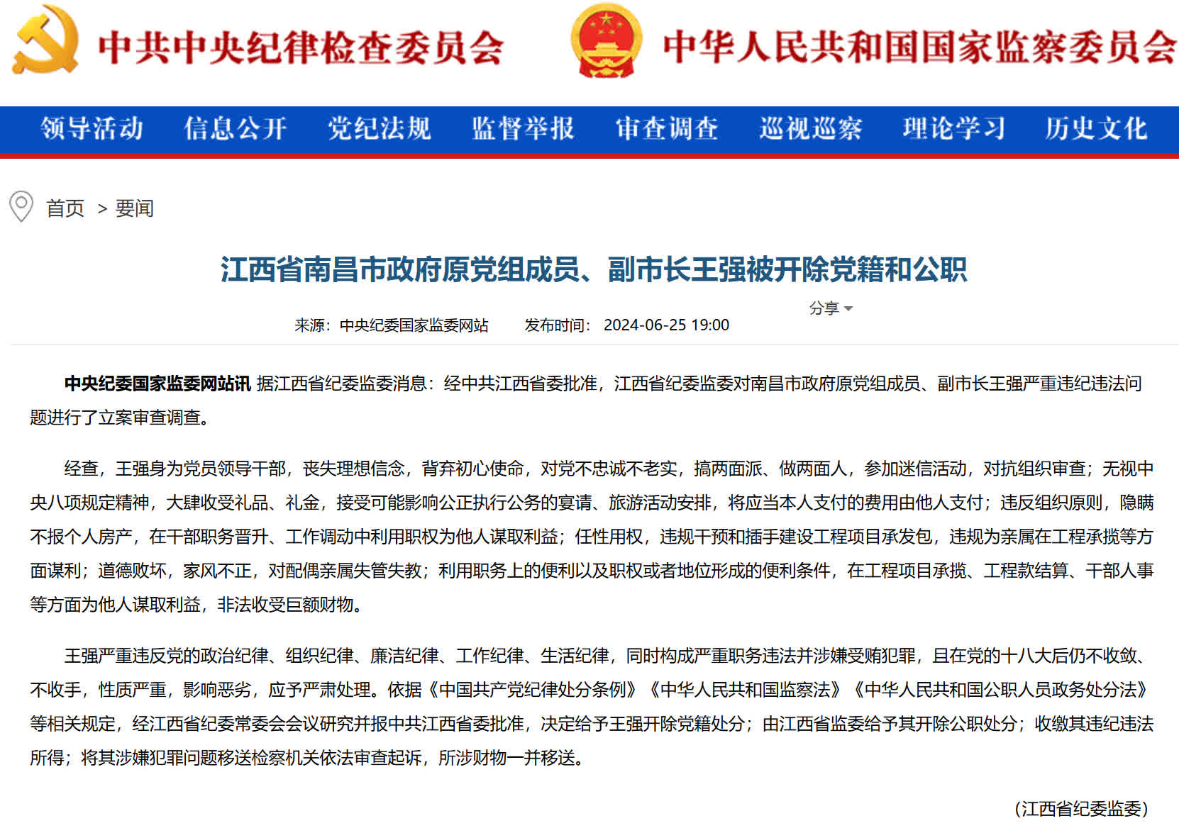 據中央紀委國家監委網站6月25日消息,經中共江西省委批准,江西省紀委監委對南昌市政府原黨組成員、副市長王強嚴重違紀違法問題進行了立案審查調查。