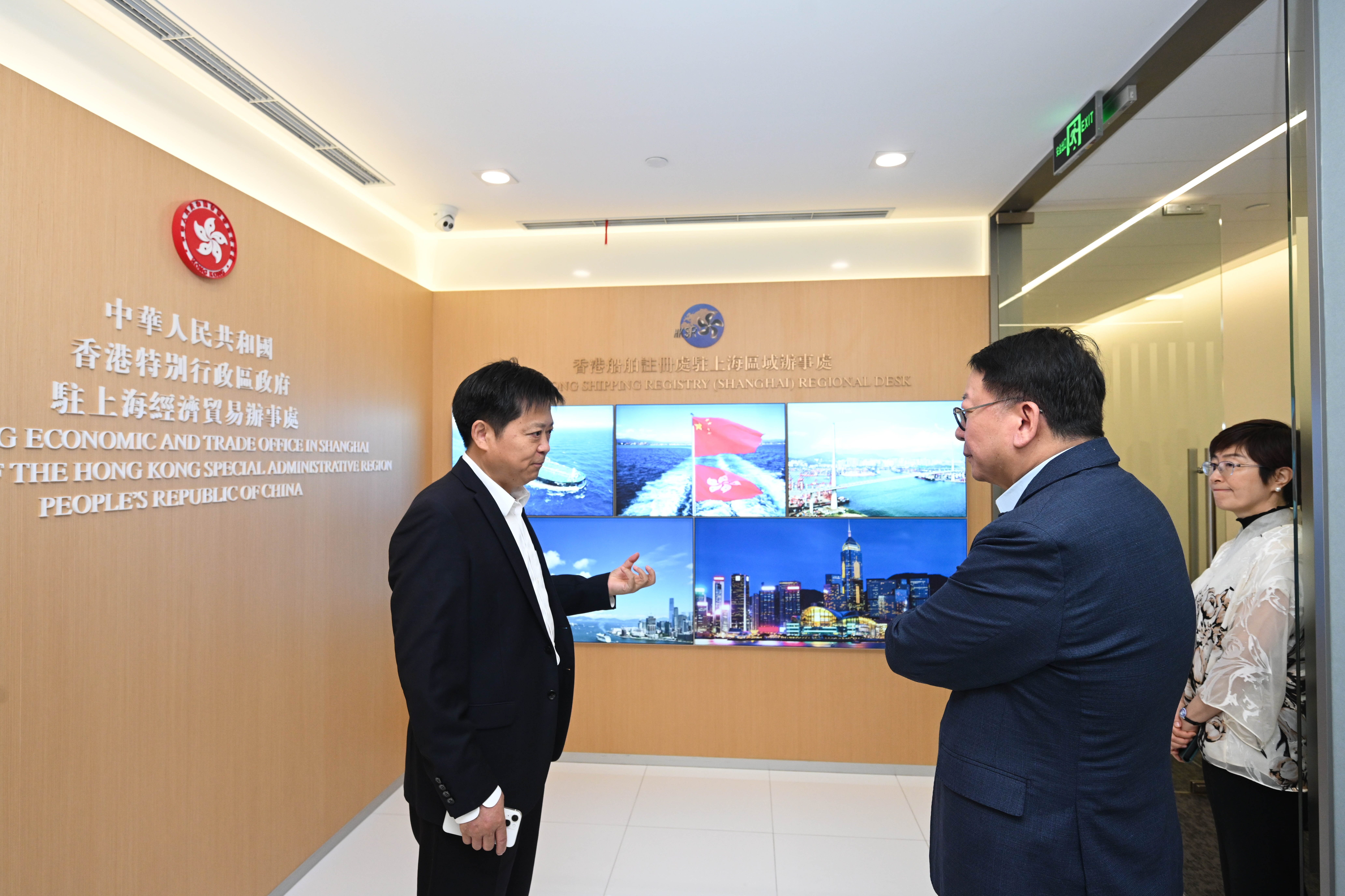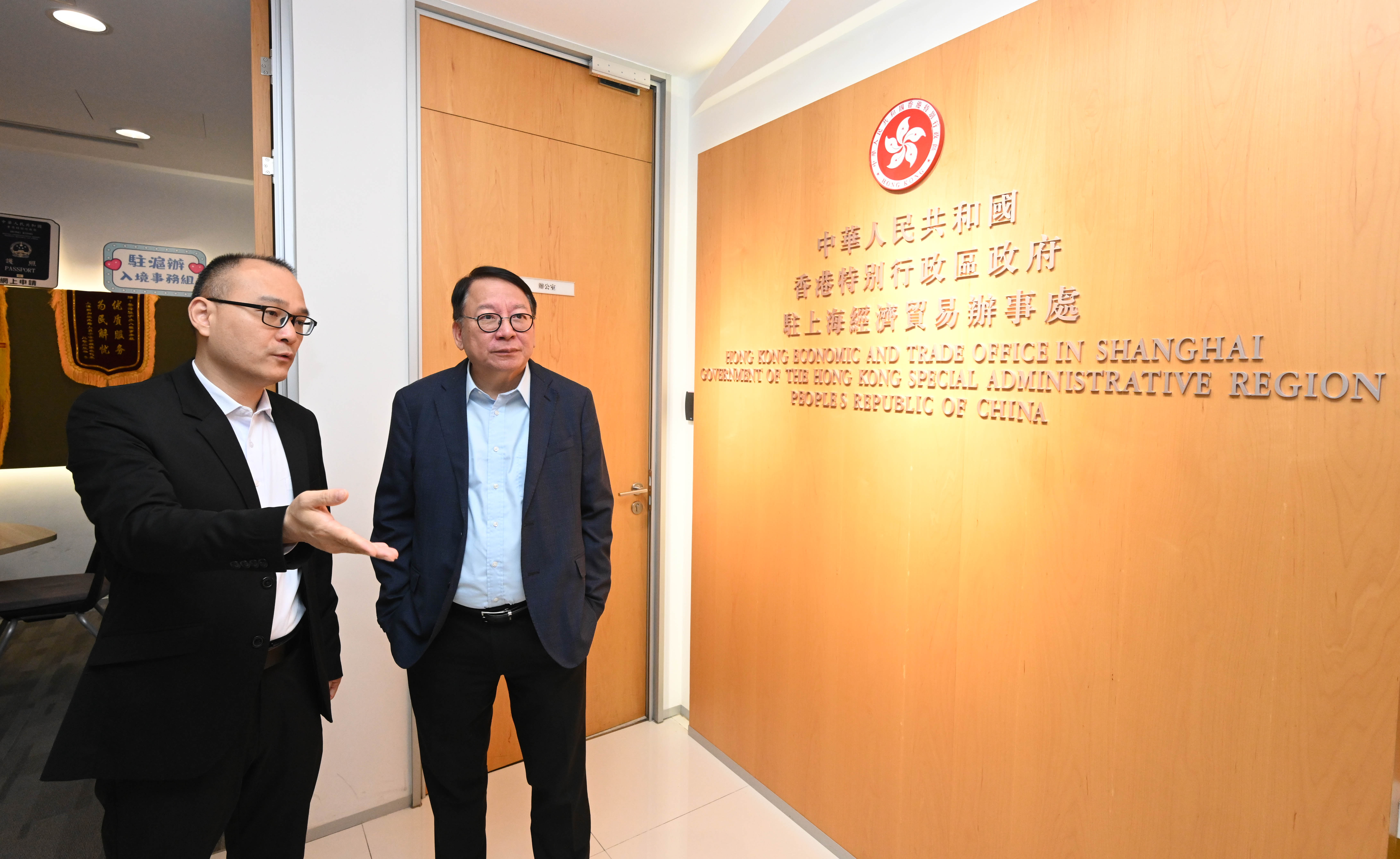 陳國基接着前往香港特別行政區(特區)政府駐上海經濟貿易辦事處(駐滬辦),聽取同事的工作匯報,亦與在該辦實習的香港學生傾談。他欣悉,自去年香港與內地全面通關以來,駐滬辦積極出訪內地多個省市,舉辦並參與多個投資推廣活動、展覽、文藝表演和青年活動等,全力宣傳推廣香港。