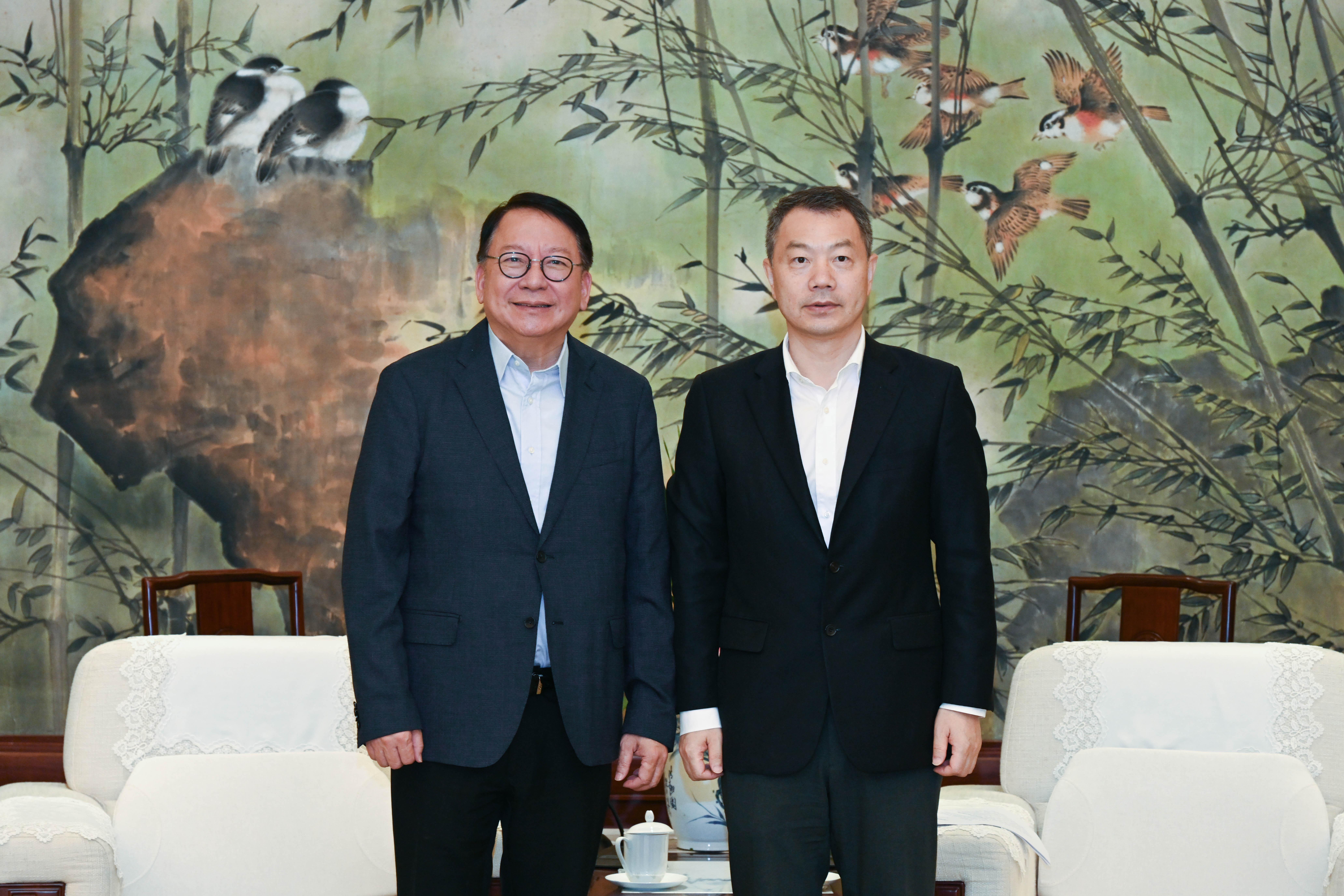早上,陳國基先與上海市副市長陳傑會面,討論滬港共同關注的事宜。陳國基指出,滬港合作會議機制已成立20多年,兩地交流合作取得豐碩成果。繼滬港合作會議第六次會議今年四月圓滿舉行後,兩地政府部門和相關機構全力在商貿、金融、創科、文創、教育、青年發展等多元領域深化交流合作,攜手發展彼此新質生產力。