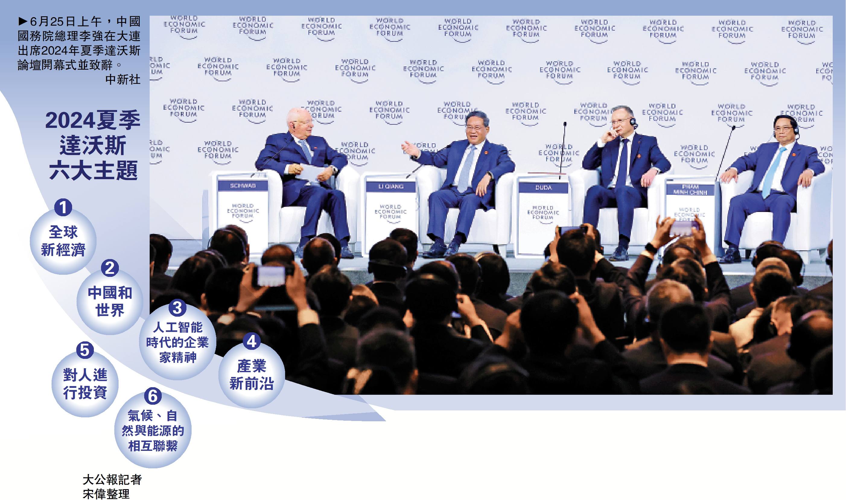 大公報據新華社報道:國務院總理李強6月25日上午在大連出席2024年夏季達沃斯論壇開幕式並致辭。李強強調,要正視世界經濟面臨的增長困境,以更高遠的視野、更寬廣的胸襟來對待發展問題,把握新一輪科技革命和產業變革的重大機遇,在共同做大蛋糕中尋求自身合理利益,開闢經濟增長新的動力源。要始終把握建設開放型世界經濟的大方向,維護開放市場環境,反對「脫鈎斷鏈」,維護產業鏈供應鏈穩定暢通,推進貿易和投資自由化便利化,引導推動全球化健康發展。我們有信心、有能力實現全年5%左右的增長目標。
