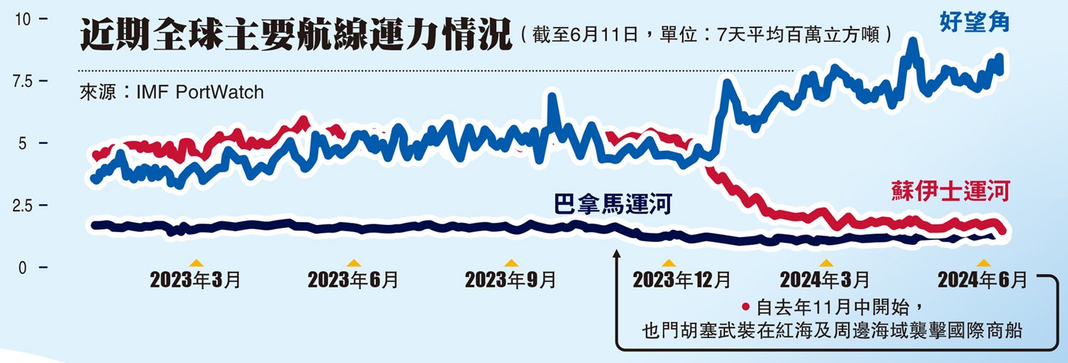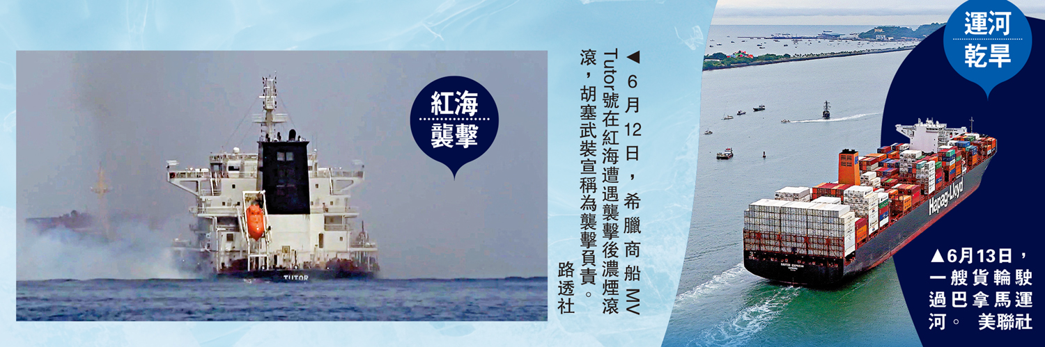 大公報報道,去年巴以衝突爆發後,也門胡塞武裝從11月起持續向經過紅海的國際商船開火,目前已有兩艘船隻遇襲後在紅海海域沉沒。許多往來亞洲、歐洲與美國東岸的船隻因此避走紅海,繞遠道走非洲好望角路線,使得航程延長至少兩周,運費不斷攀升。目前,通過蘇伊士運河的集裝箱運輸量下降到平時的十分之一。