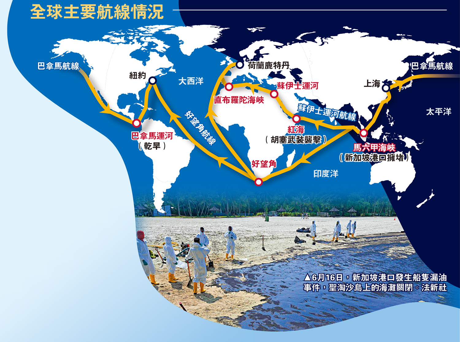 與此同時,海運商把船隊集中在最賺錢的航線上,即連接中國上海和荷蘭鹿特丹港等歐亞航線上,這就迫使運往其他地方的貨物,要留在轉運港停留卸貨和再裝貨,造成包括新加坡港口和斯里蘭卡首府科倫坡港在內的港口擁堵。