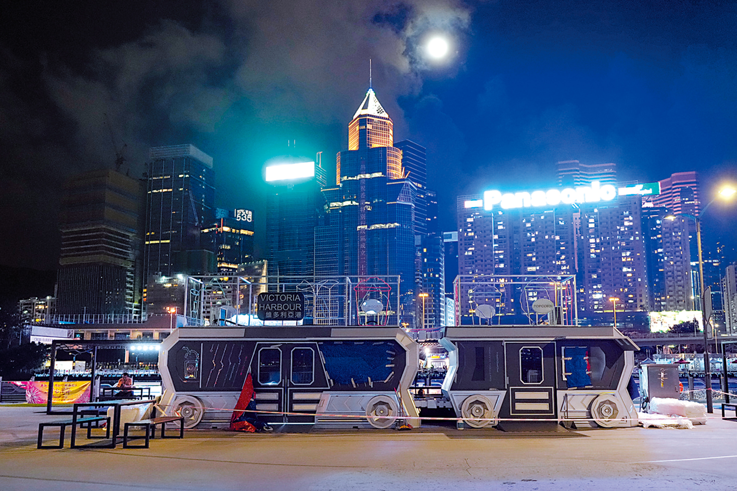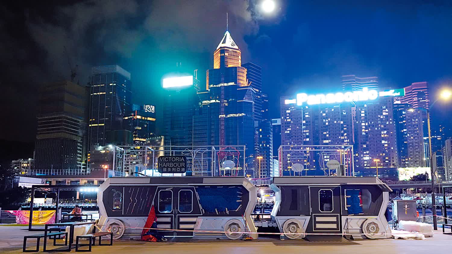 「智能零售機」現已在灣仔海濱測試運作,附近是退役「烏蠅頭」列車展示地點。大公報記者近日實地觀察,放置「智能零售機」的設施大約一層樓高,外形設計像餐車,風格和「烏蠅頭」列車呼應,設施頂部有些雪糕、飲品造型的霓虹燈裝飾,有些在晚上「試燈」。