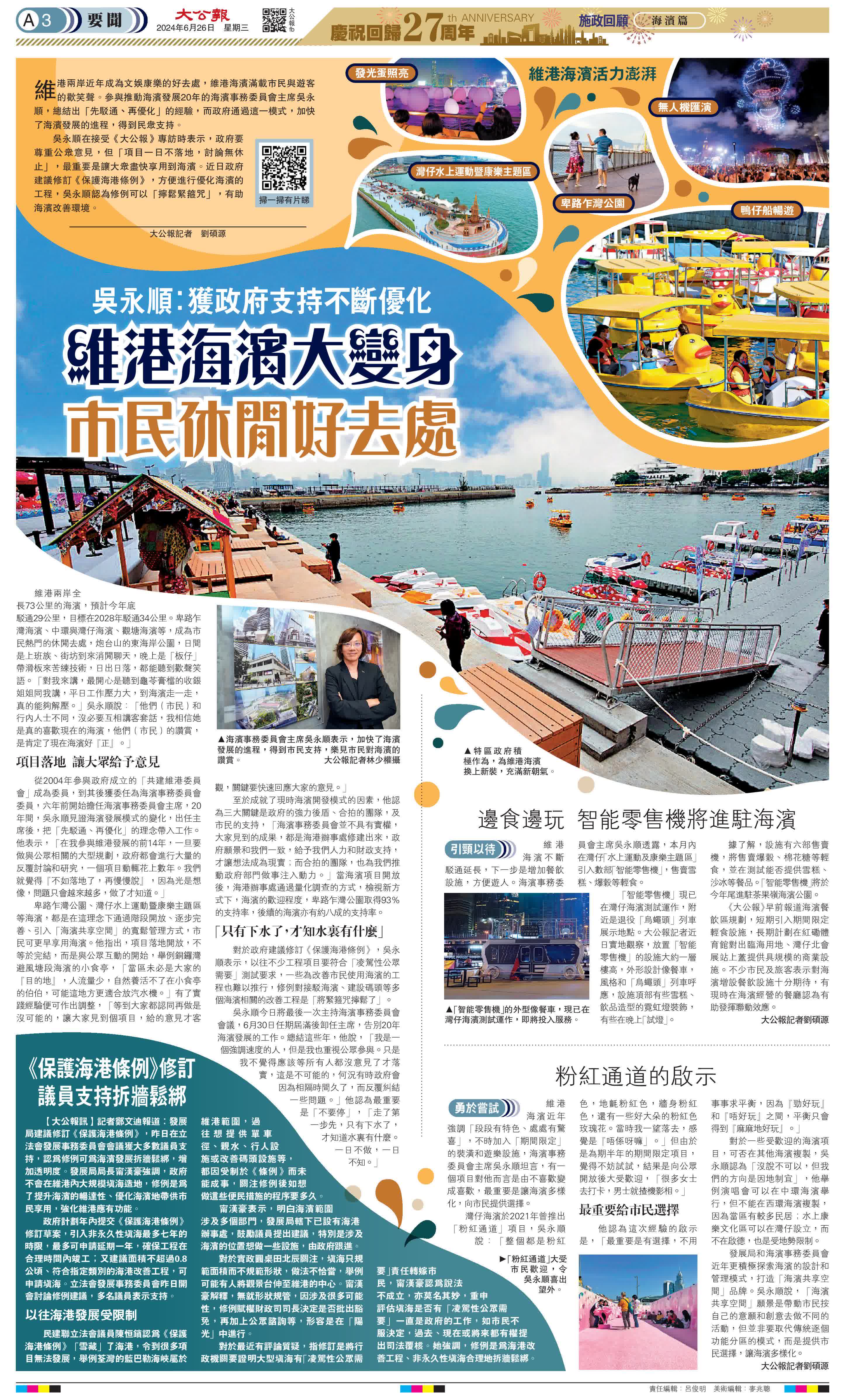 (大公報 記者 劉碩源)維港兩岸近年成為文娛康樂的好去處,維港海濱滿載市民與遊客的歡笑聲。參與推動海濱發展20年的海濱事務委員會主席吳永順,總結出「先駁通、再優化」的經驗,而政府通過這一模式,加快了海濱發展的進程,得到民眾支持。
