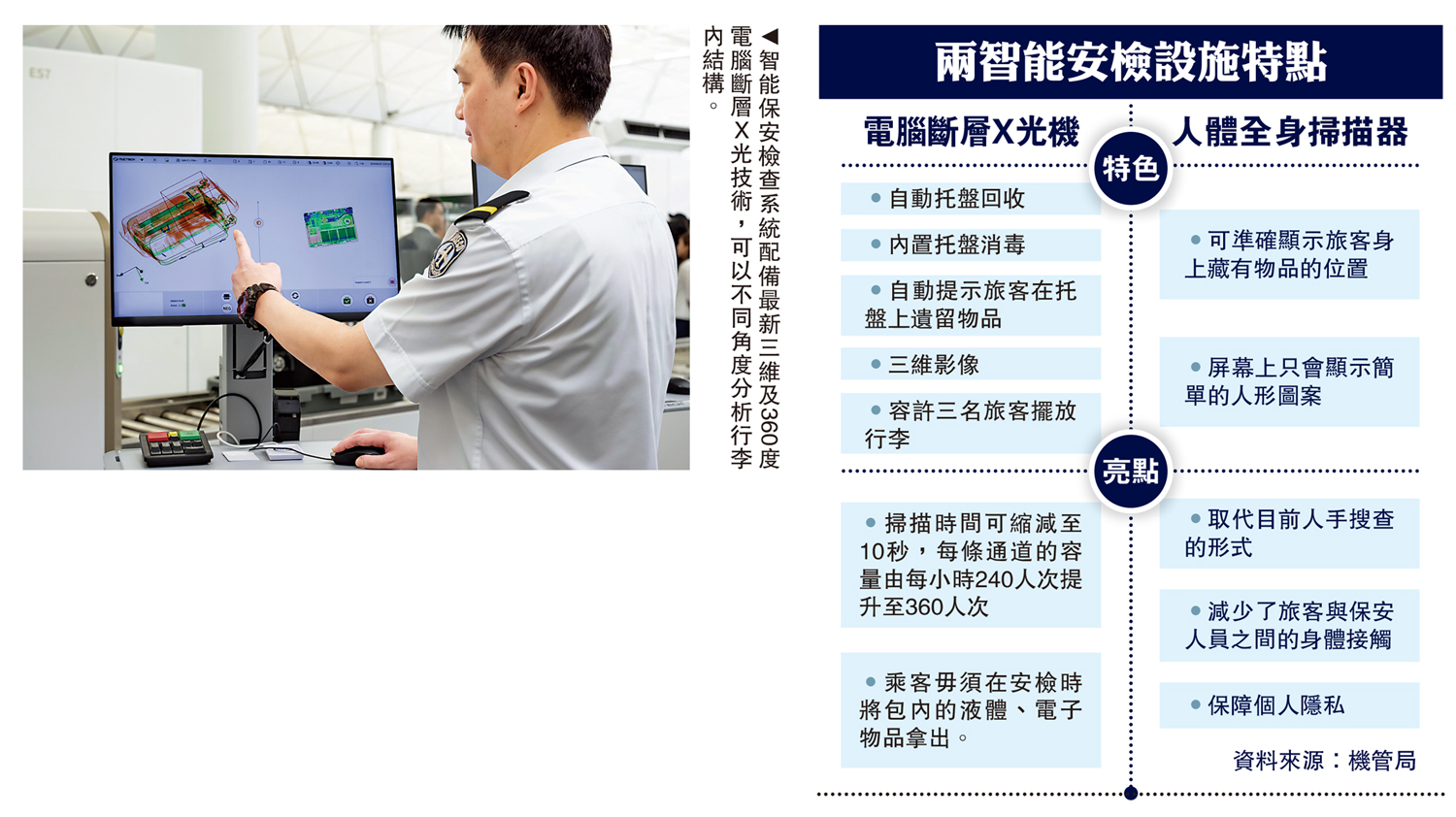 (大公報 記者 劉碩源)機場管理局昨日宣布,投入超過8億元,在機場引入多項智能保安檢查設施,包括電腦斷層X光機、人體全身掃描器,7月2日分階段安裝,預計兩年內完成,香港機場將成為全球首個全面採用智能安檢系統的機場。新系統下,旅客於行李進行安檢時毋須取出液體、電子產品等物件,而整體平均處理量提升近兩成。
