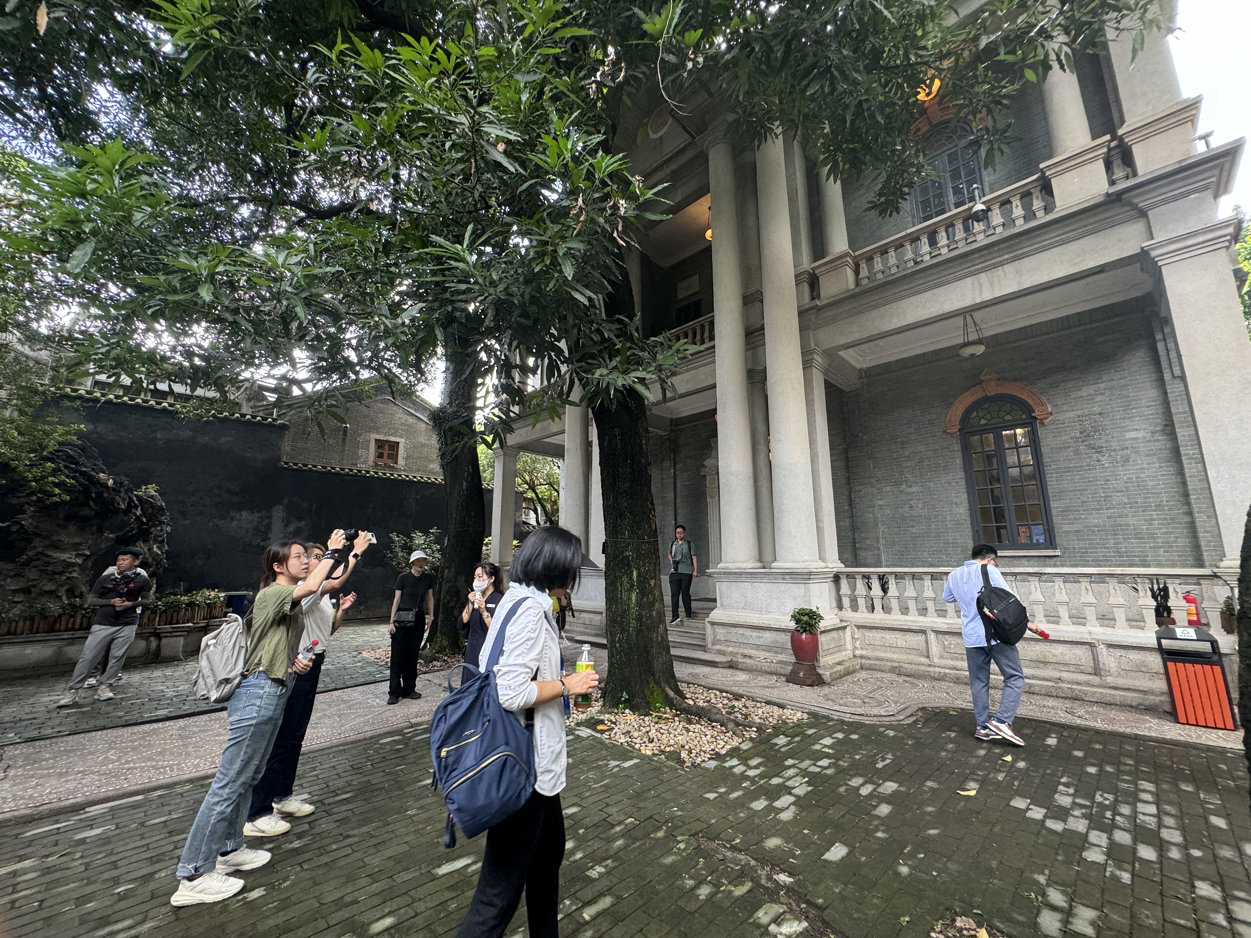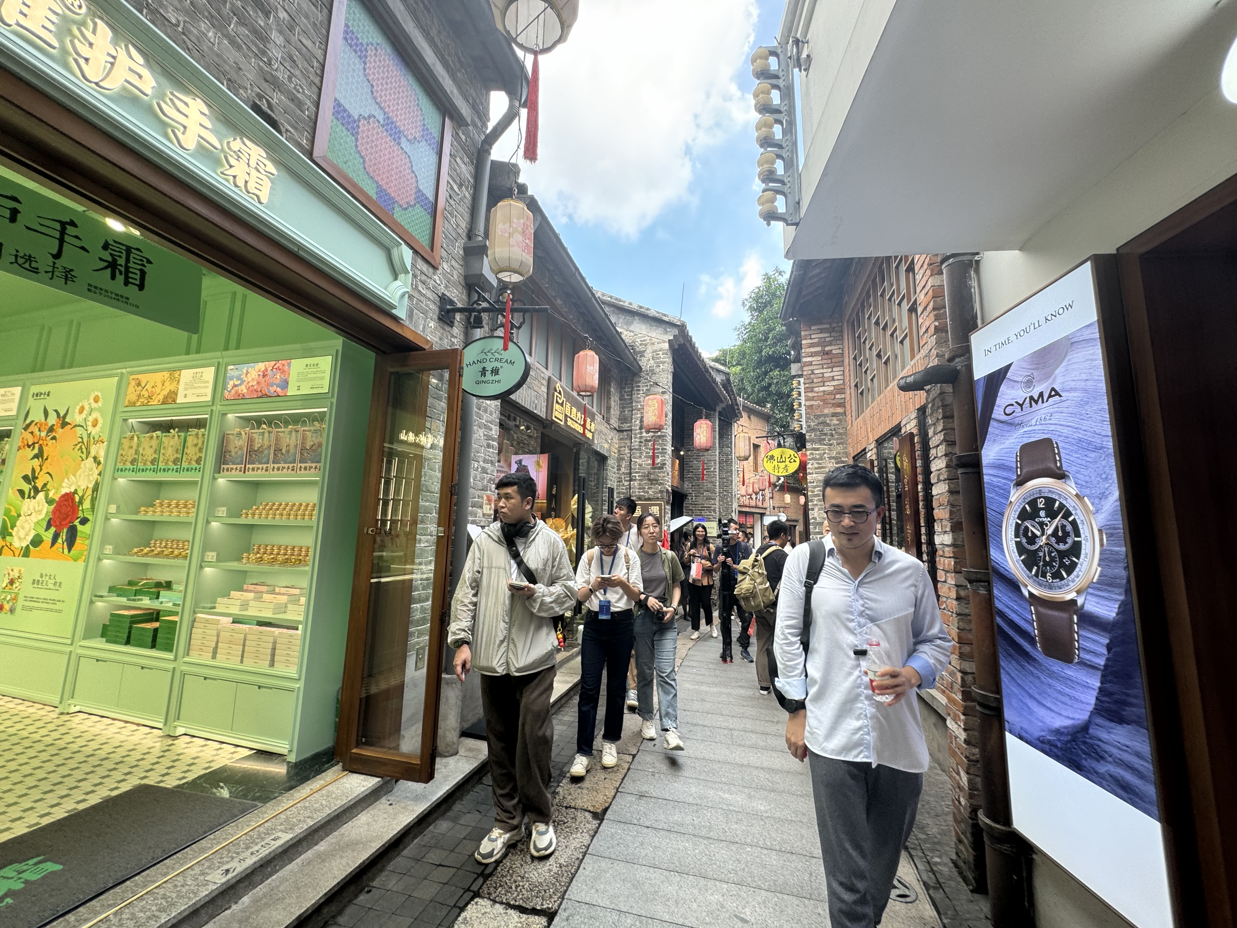 採訪團先走訪了祖廟、黃飛鴻紀念館,不少具有嶺南文化特色的建築,隨後來到佛山嶺南天地項目。穿梭在青磚屋、石板路、鑊耳牆、雕花屋檐中,記者看到的時尚小店、咖啡館、小酒館一家接着一家,當中亦有不少年輕的茶飲消費牌子。嶺南天地項目總佔地面積約63萬平方米,擁有128棟歷史建築、8條歷史街巷、300多家商戶,是嶺南廣府文化資源最集中的區域。
