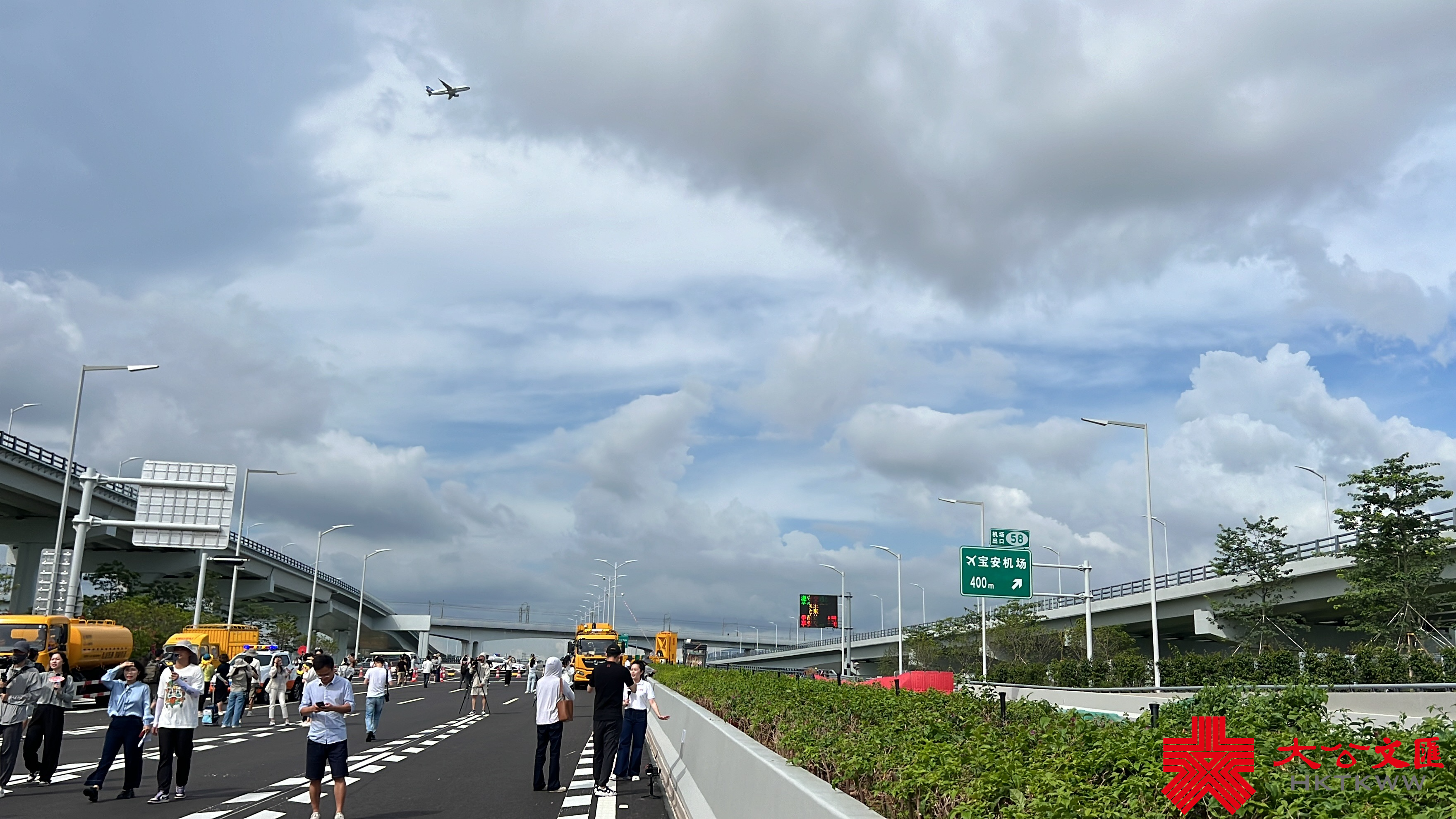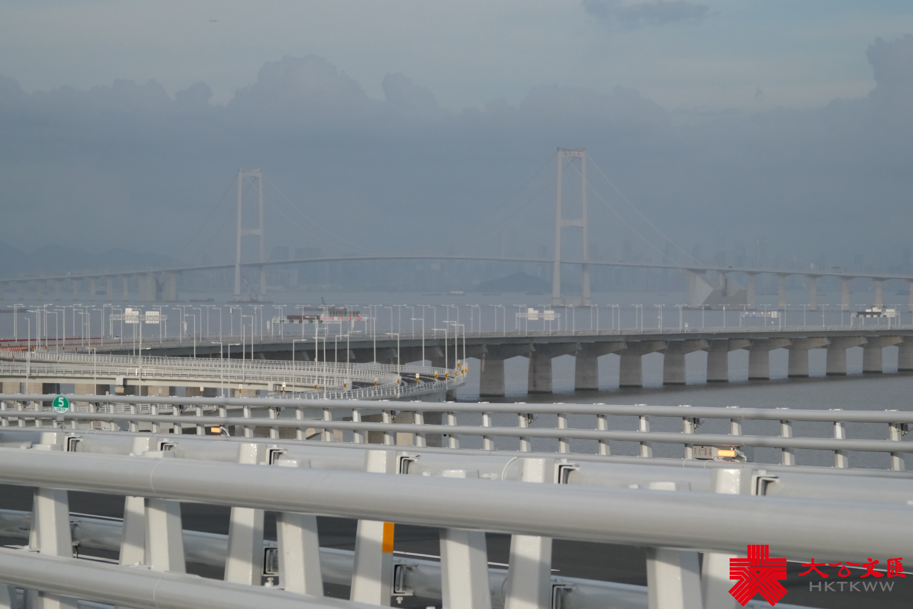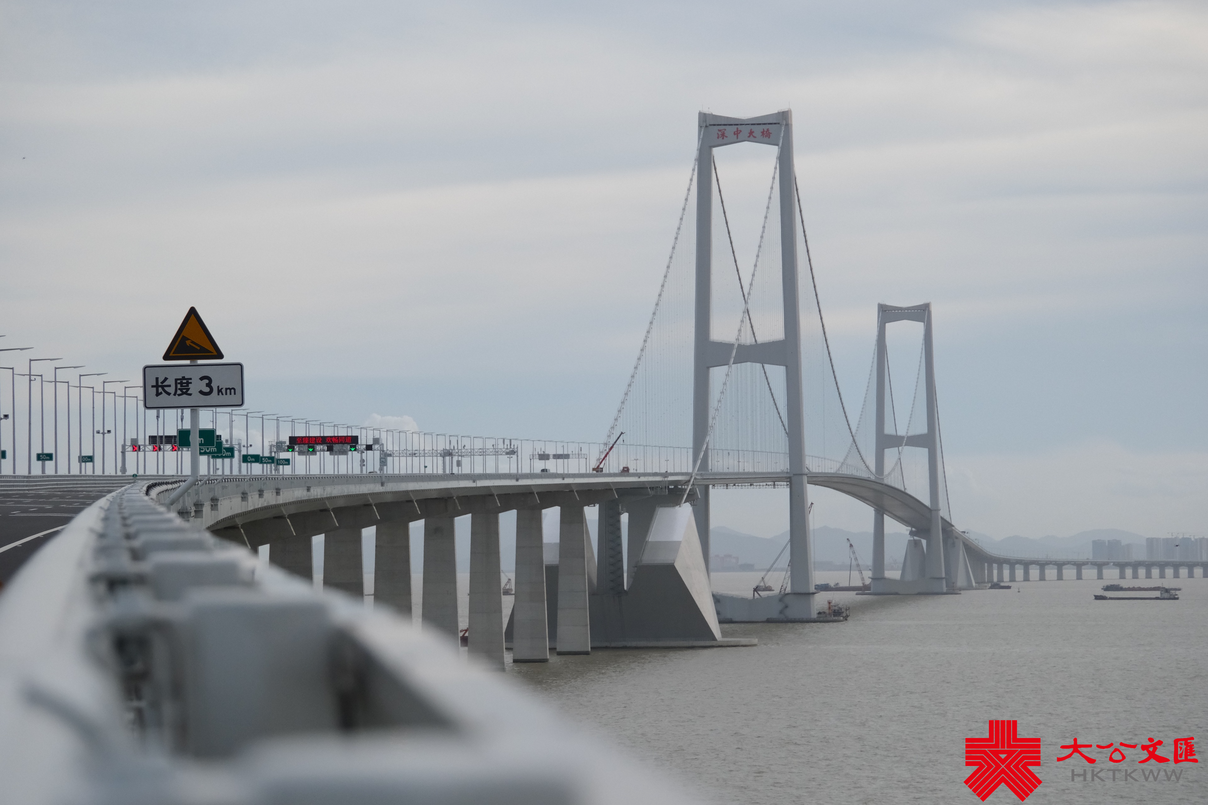 記者27日下午參加通車前最後一次媒體開放日活動,再次打卡深中通道。記者乘大巴從中山段上橋,往深圳方向行駛,左手邊經過南沙萬頃沙,右邊可以看到淇澳島和深圳的黑沙灣。今天天氣晴朗,藍天白雲,途徑黑沙灣時記者還可以看到後方的香港屯門區。