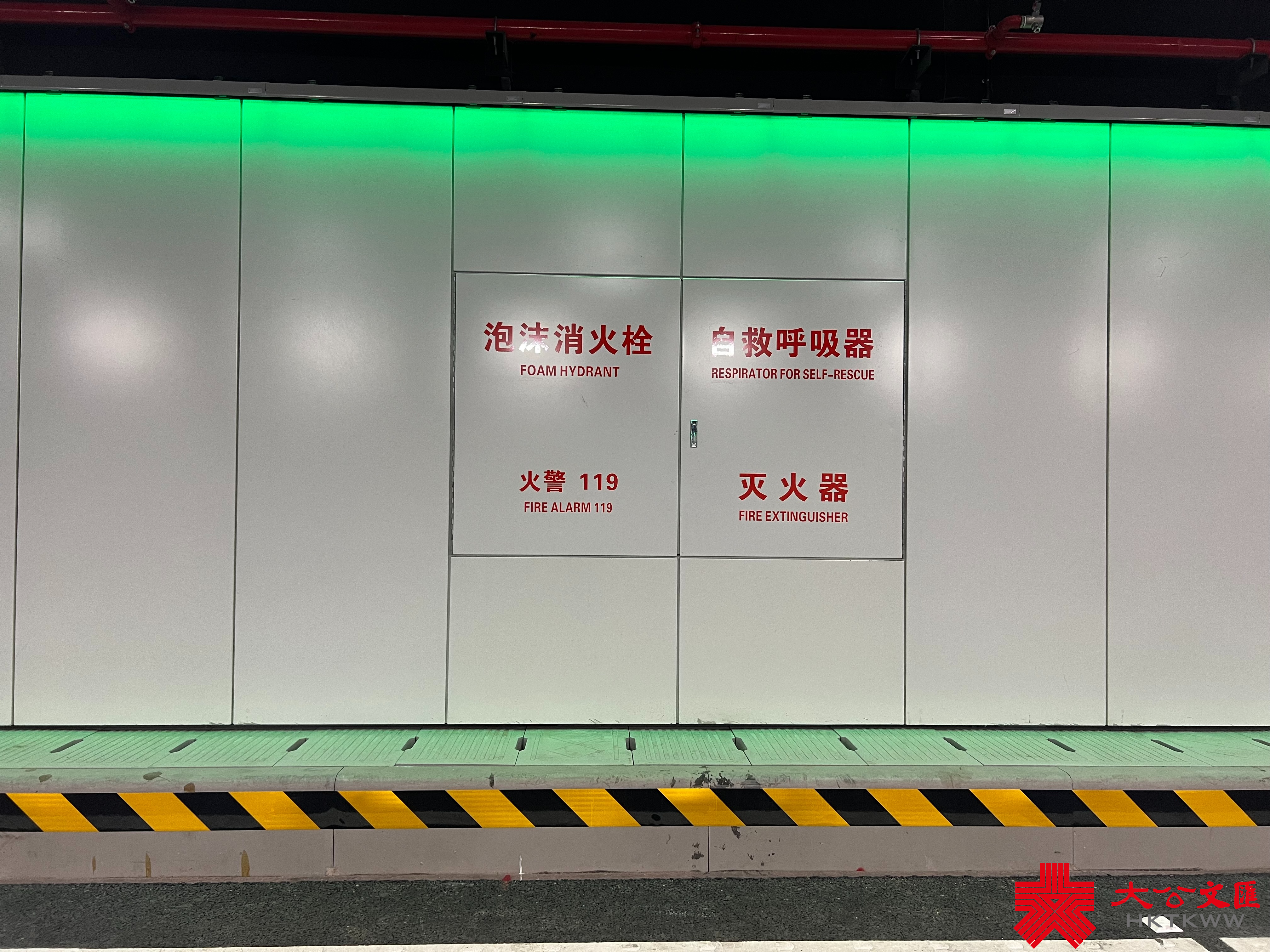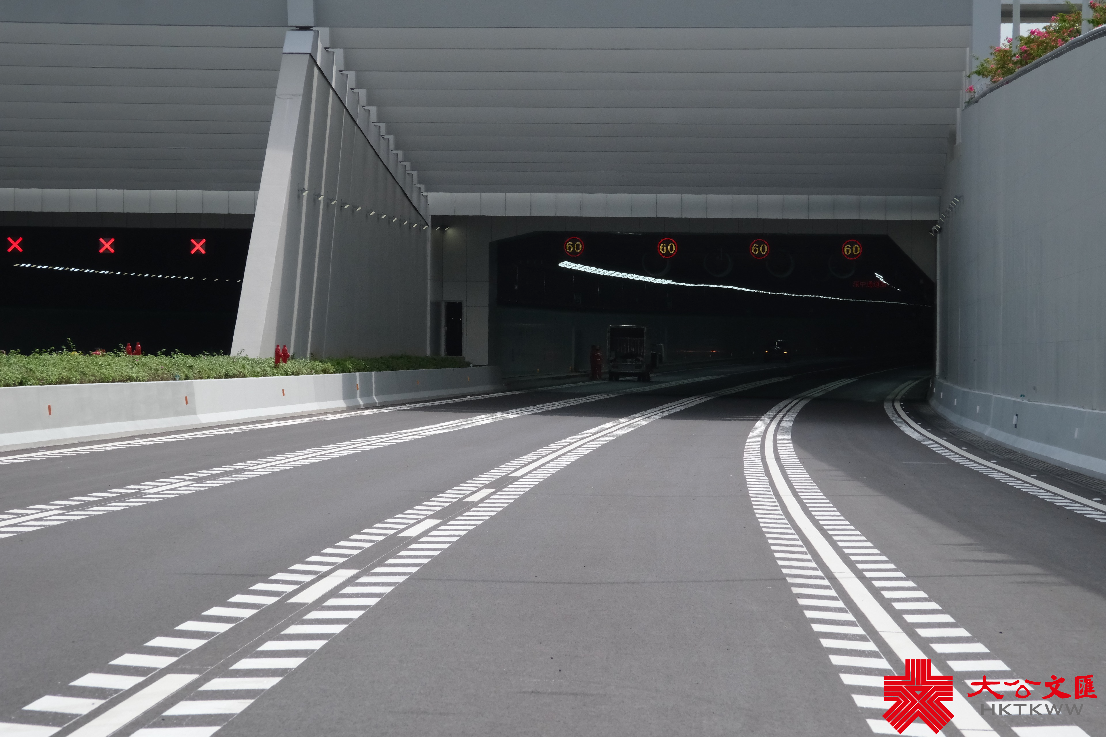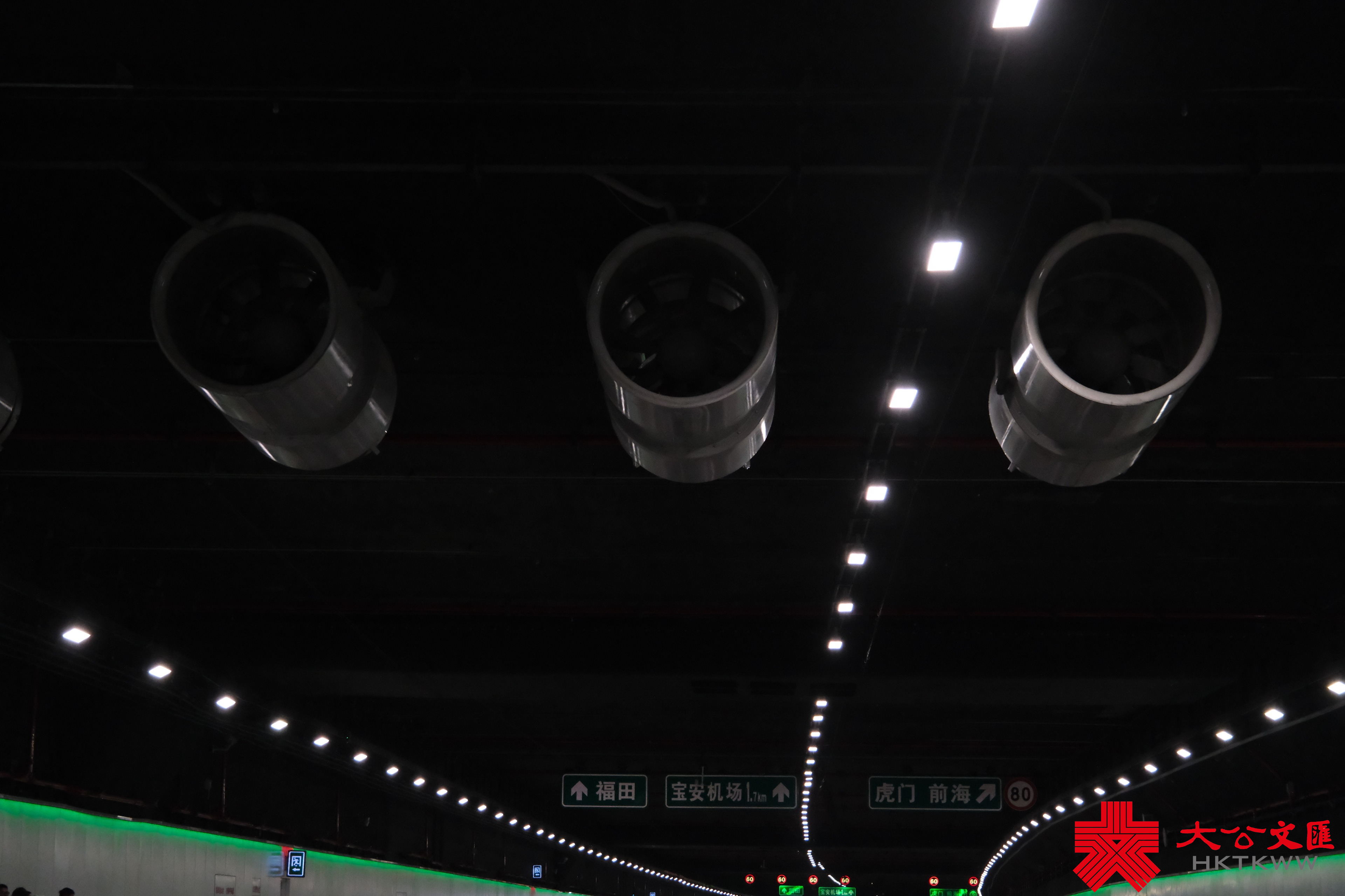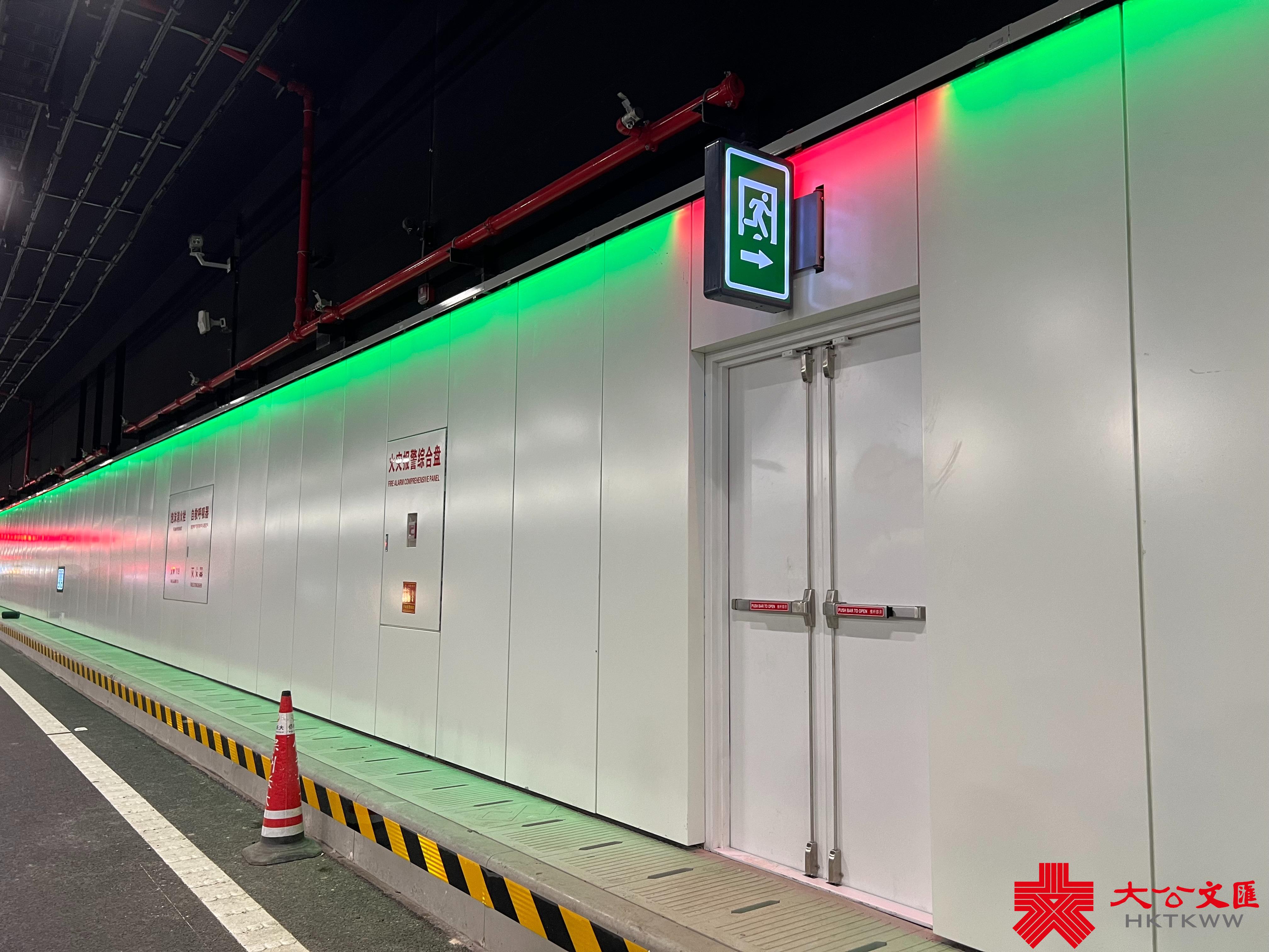 大巴以每小時50公里的速度前行,約25分鐘後經西人工島進入隧道。只見隧道內兩側是綠色景觀燈帶,以及每隔一段距離就能看到綠色安全門指引標記。同時,隧道內還設置有火災報警綜合盤、泡沫消火栓、自救呼吸器、射流風機控制箱等安全設施。這條全長6845米的海底隧道,是世界上最長、最寬的海底鋼殼混凝土沉管隧道,最深的地方在海平面之下39米。但記者現場實測,全程有5G信號,在地圖上能清晰看到位置變動。