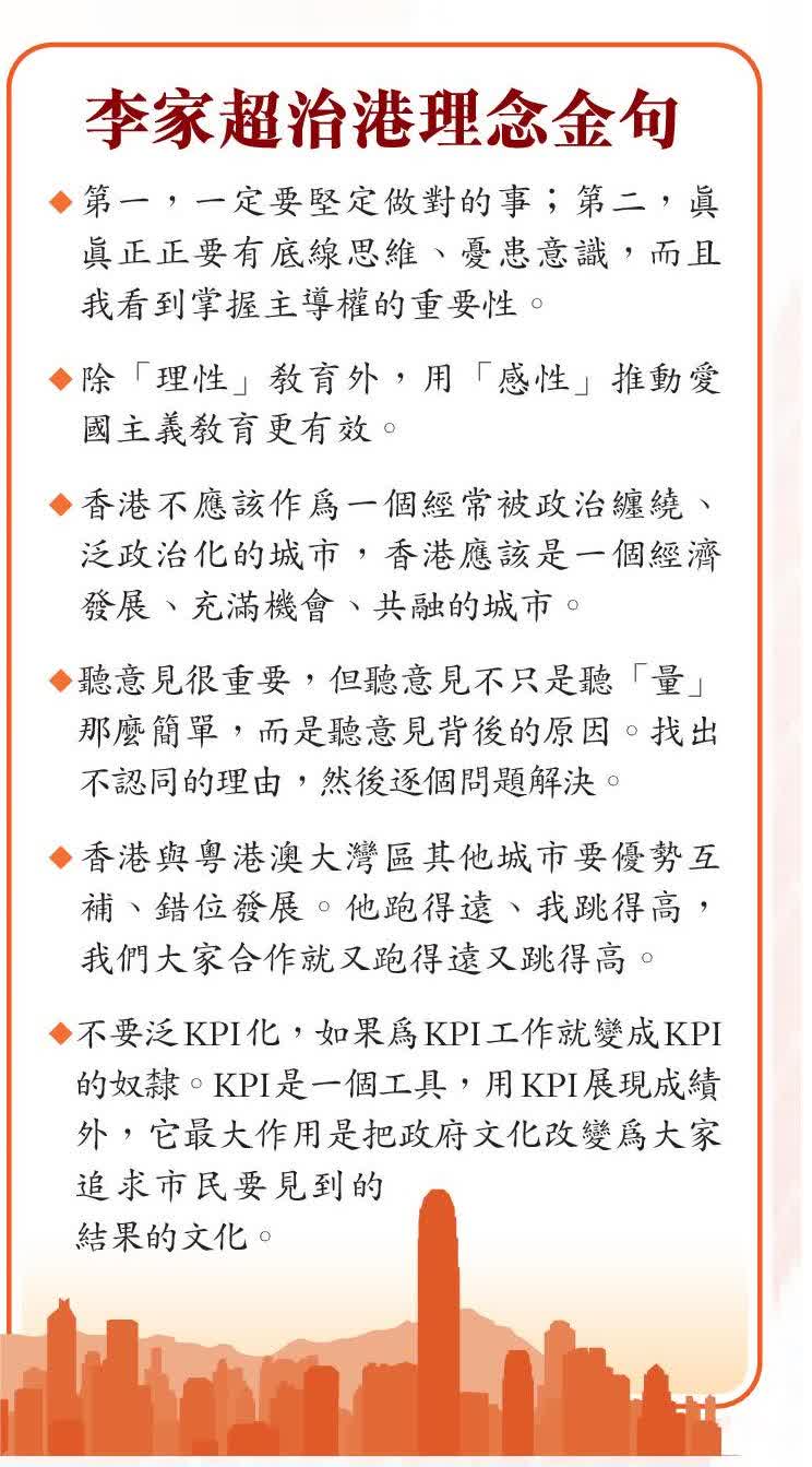 「人民福祉最重要,人民福祉如何來?不是政治鬥爭,人民福祉從大家的經濟活動、民間往來、商業機遇等開創的天地中來。」如何為人民謀福祉,李家超有清晰的理念:「第一,一定要堅定做對的事;第二,真真正正要有底線思維、憂患意識,而且我看到掌握主導權的重要性。」在未來的施政過程中,他會深思如何在政策中拿主導權,從而帶領社會凝聚共識共建香港,不被外部勢力所消耗。