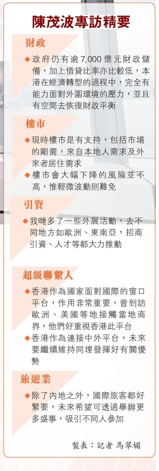 特區政府連續兩個財政年度錄得過千億元赤字,如何解決財赤問題備受關注。陳茂波先派定心丸,表示諗加稅不如先諗點搞好經濟做大個餅。他指,經歷了幾年的疫情,全世界不同的政府都是赤字預算,因此本港亦不例外,雖然在現時經濟環境下,政府賣地收入比以往少是預期之內,惟政府仍有逾7,000億元財政儲備,加上借貸比率亦比較低,因此本港在經濟轉型的過程中,仍完全有能力面對外圍環境的壓力,並且有2至3年的空間去恢復財政平衡。