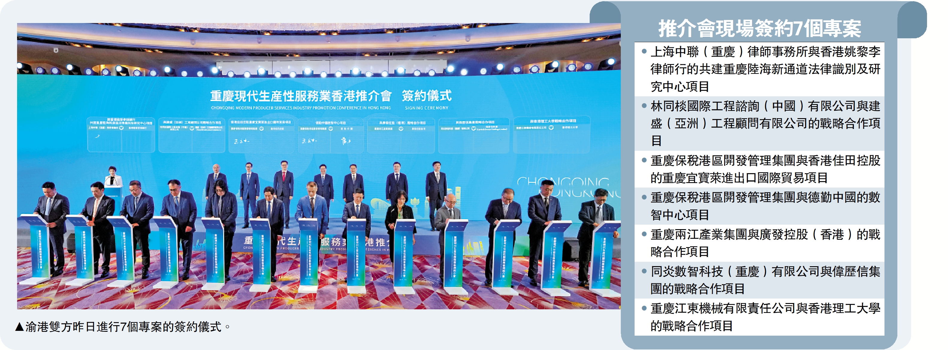 (大公報 記者 韓毅、黃洋港)重慶現代生產性服務業香港推介會昨日在港舉行。重慶市市長胡衡華在致辭中表示,香港與重慶同為山水之城、區域核心城市,交流合作歷史悠久、源遠流長;財政司司長陳茂波在推介會上表示,香港與重慶各具優勢,互補性強,合作前景廣闊,相信在兩地政府和業界的共同努力下,渝港合作一定能夠邁上新的台階,取得更加豐碩的成果。在昨日推介會現場,渝港雙方進行7個專案的簽約儀式。