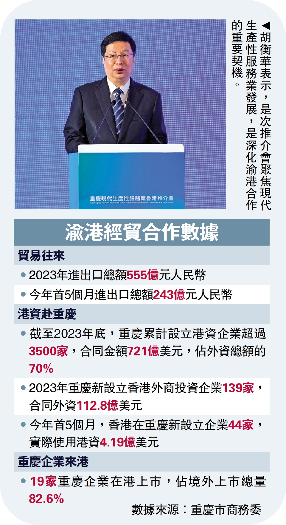 在推介會上,重慶市發展和改革委員會主任高健介紹了該市現代生產性服務業發展情況和前景。他表示,渝港經貿交流合作早已密不可分,今年首5個月兩地進出口總額達243億元(人民幣,下同),增長18.9%,期待兩地繼續在貨物貿易、服務貿易等領域深化合作、開拓創新,共同拓展國際市場。