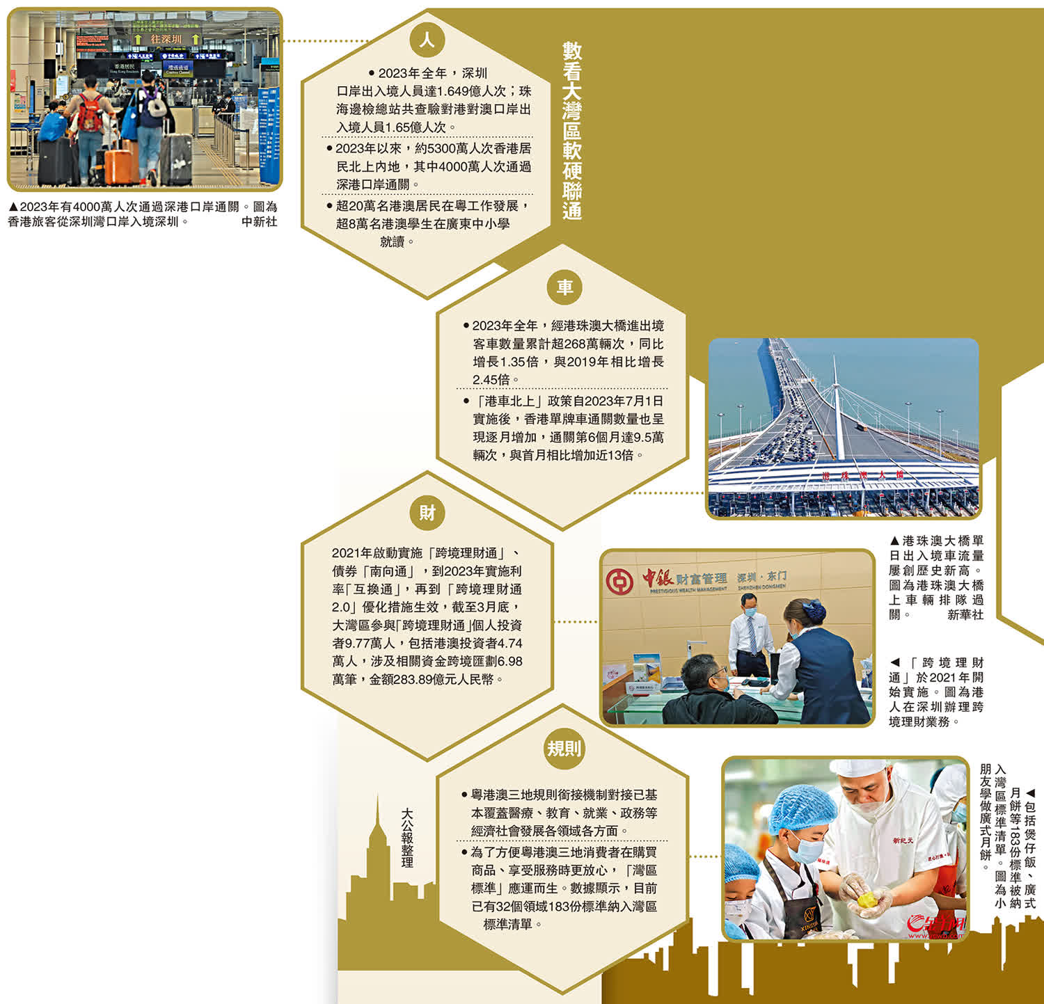 (大公報 記者 毛麗娟、方俊明)2024年是《粵港澳大灣區發展規劃綱要》出台的第五年,也是香港回歸祖國懷抱27周年。近期審議通過的《前海深港現代服務業合作區總體發展規劃》《粵港澳大灣區國際一流營商環境建設三年行動計劃》等文件,均與大灣區城市「軟硬聯通」密切相關。隨着大灣區建設的深入推進,近年來,內地與香港、澳門在專業資格互認方面取得新突破。