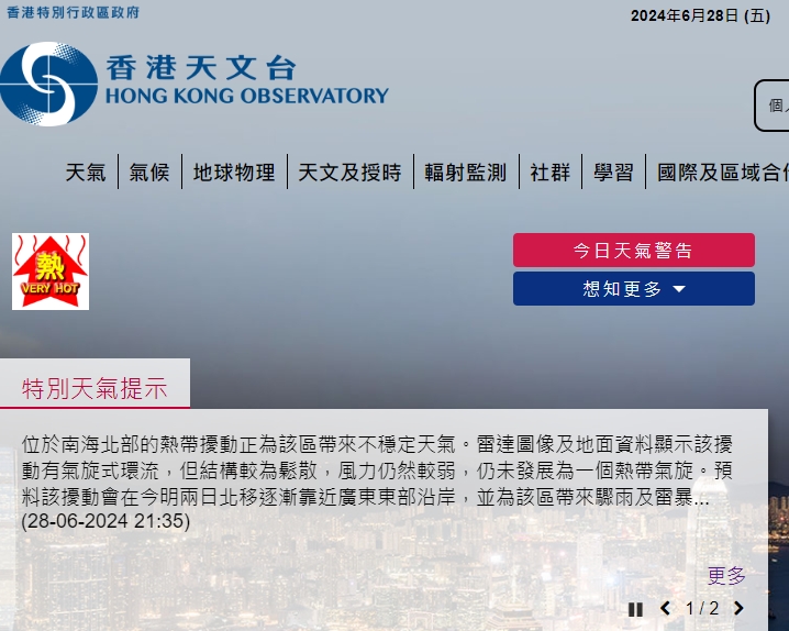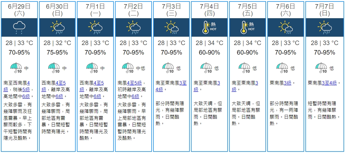 天文台預測29日大致多雲,有幾陣驟雨及狂風雷暴,早上驟雨較多,下午短暫時間有陽光及酷熱,氣溫介乎攝氏28至33度。市民外出記得帶傘。