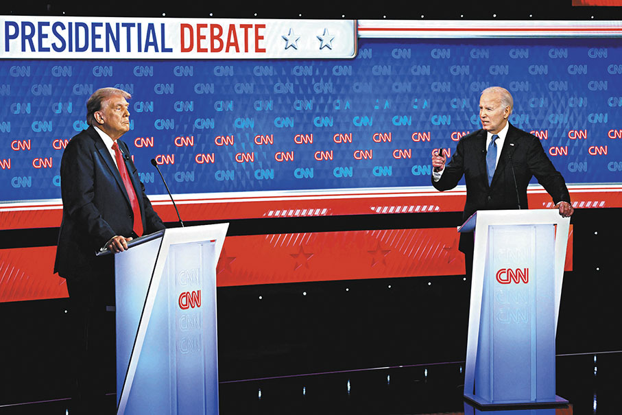 美國總統拜登和前總統特朗普時隔近4年,再次在辯論台上正面激辯。辯論長約90分鐘,拜登和特朗普先後登台,沒有握手。兩人就經濟政策、移民、墮胎權、外交政策、民主、種族、醫保等話題進行陳述,言辭激烈、情緒激動,甚至進行人身攻擊。