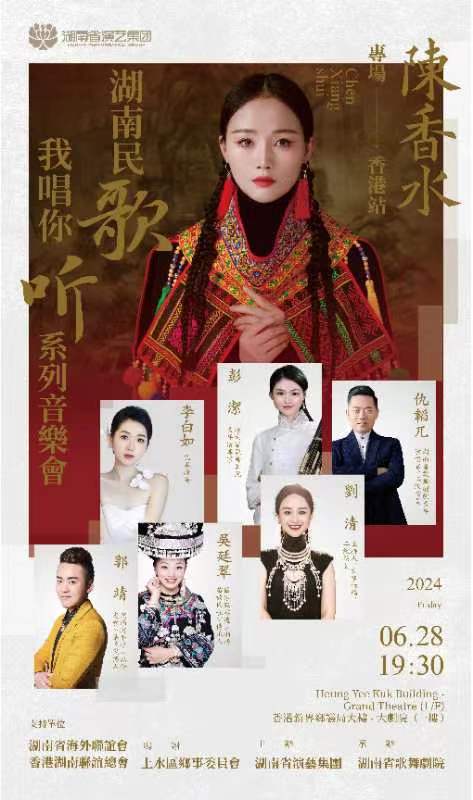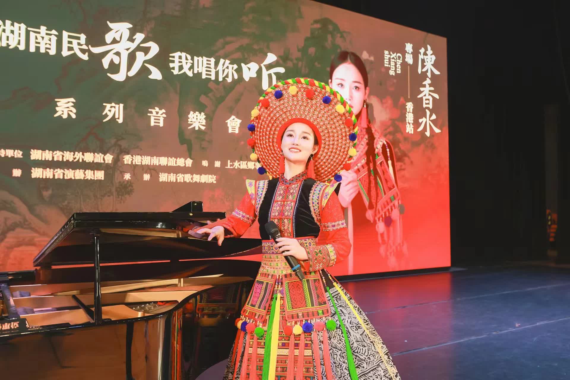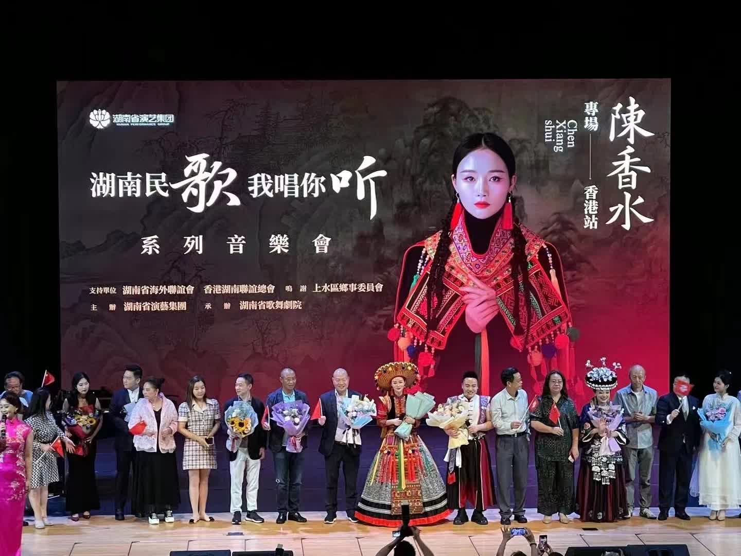 大公文匯網報道,6月28日晚,湖南省演藝集團、香港湖南聯誼總會共同主辦,湖南省歌舞劇院承辦的慶祝中華人民共和國成立75周年暨香港回歸祖國27周年活動——《湖南民歌·我唱你聽》陳香水獨唱音樂會在香港舉行。駐港中資機構代表、湖南省港區政協委員、香港省級同鄉社團代表、香港新界鄉議局、上水區鄉事委員會、湖南各市州聯誼會會員和香港當地觀眾共1000多人觀看演出,劇場外,五星紅旗和紫荊花旗高高飄揚,劇場內,氣氛熱烈,湘情濃郁,流淌着濃濃的愛國情懷。