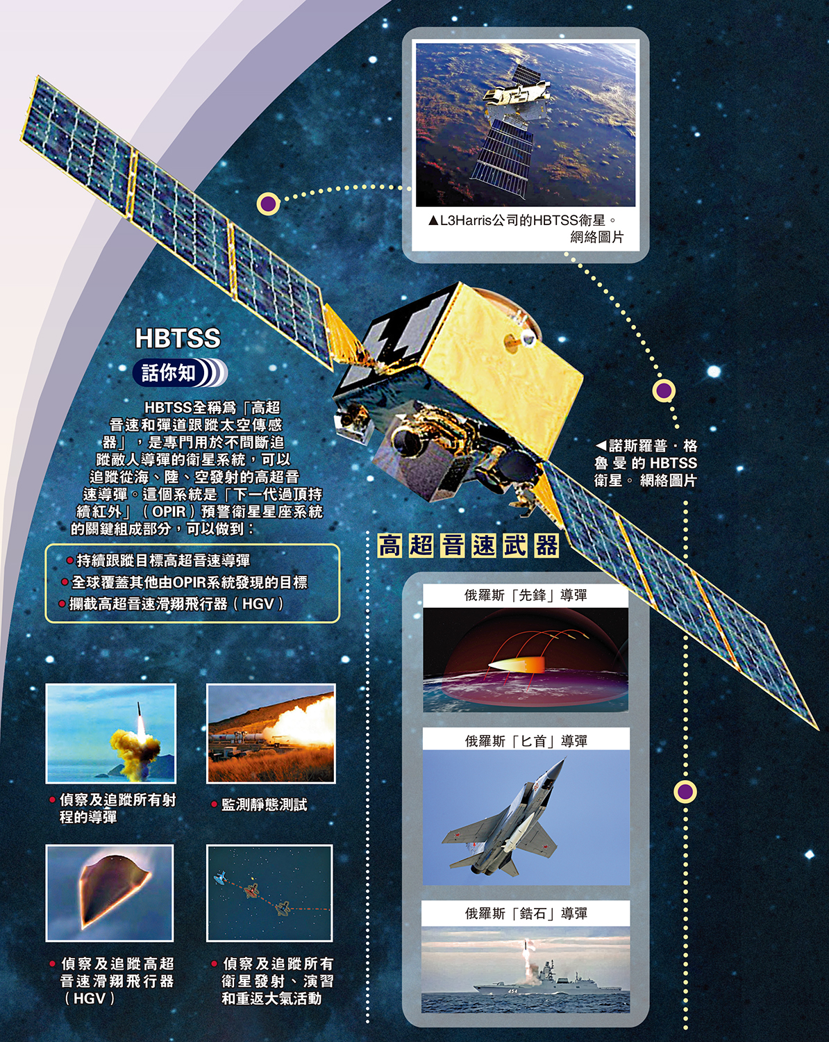 美國《防務新聞》透露,軍火商L3Harris和諾斯羅普·格魯曼分別為美國導彈防禦局打造了一款用來追蹤高超音速和彈道導彈飛行器的空間傳感器(HBTSS),與太空開發局(SDA)的空間跟蹤衛星一起,追蹤高超音速武器。這是太空開發局監測衛星星座(即人造衛星共同運作系統)的一部分,旨在探測和觀測以5馬赫或更高速飛行的高超音速飛行器。美軍目前有10枚導彈追蹤衛星在軌,其中8枚來自太空開發局,2枚來自導彈防禦局。