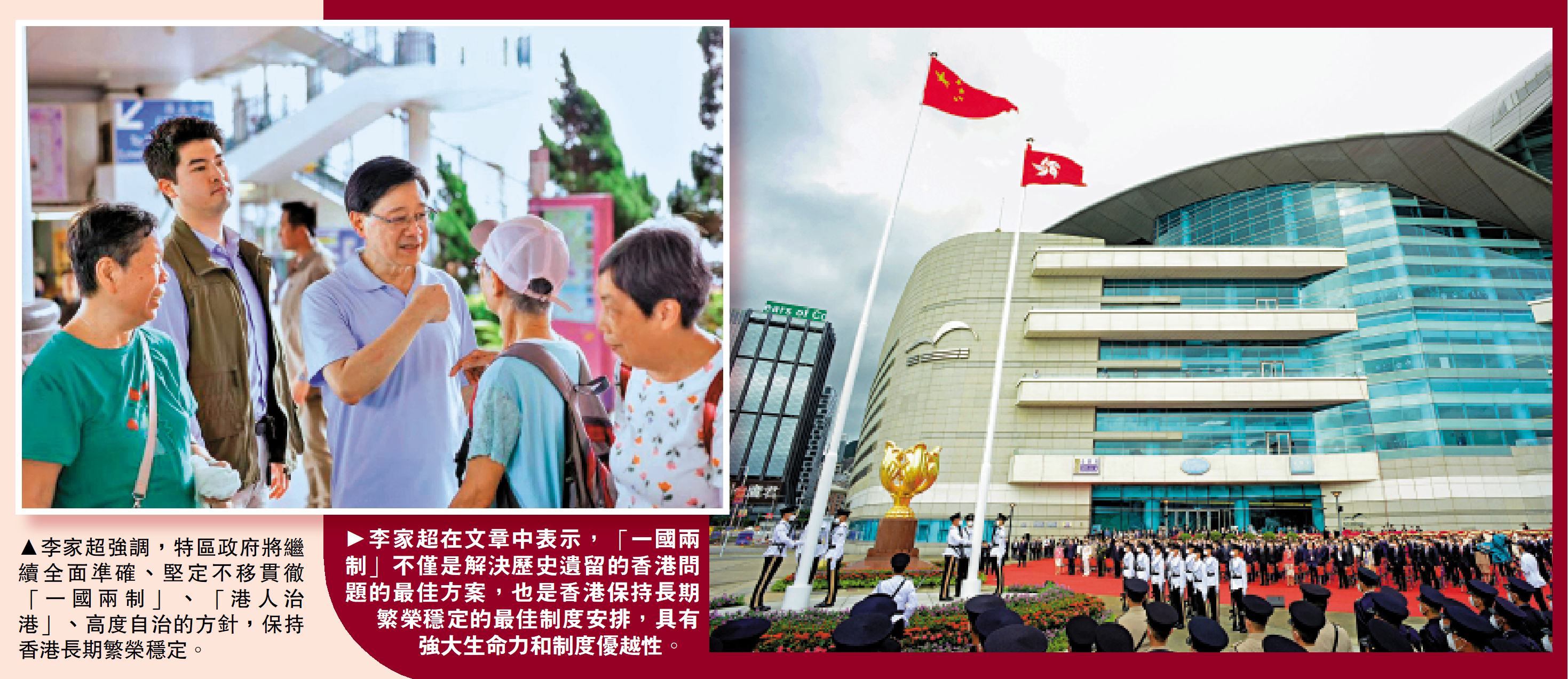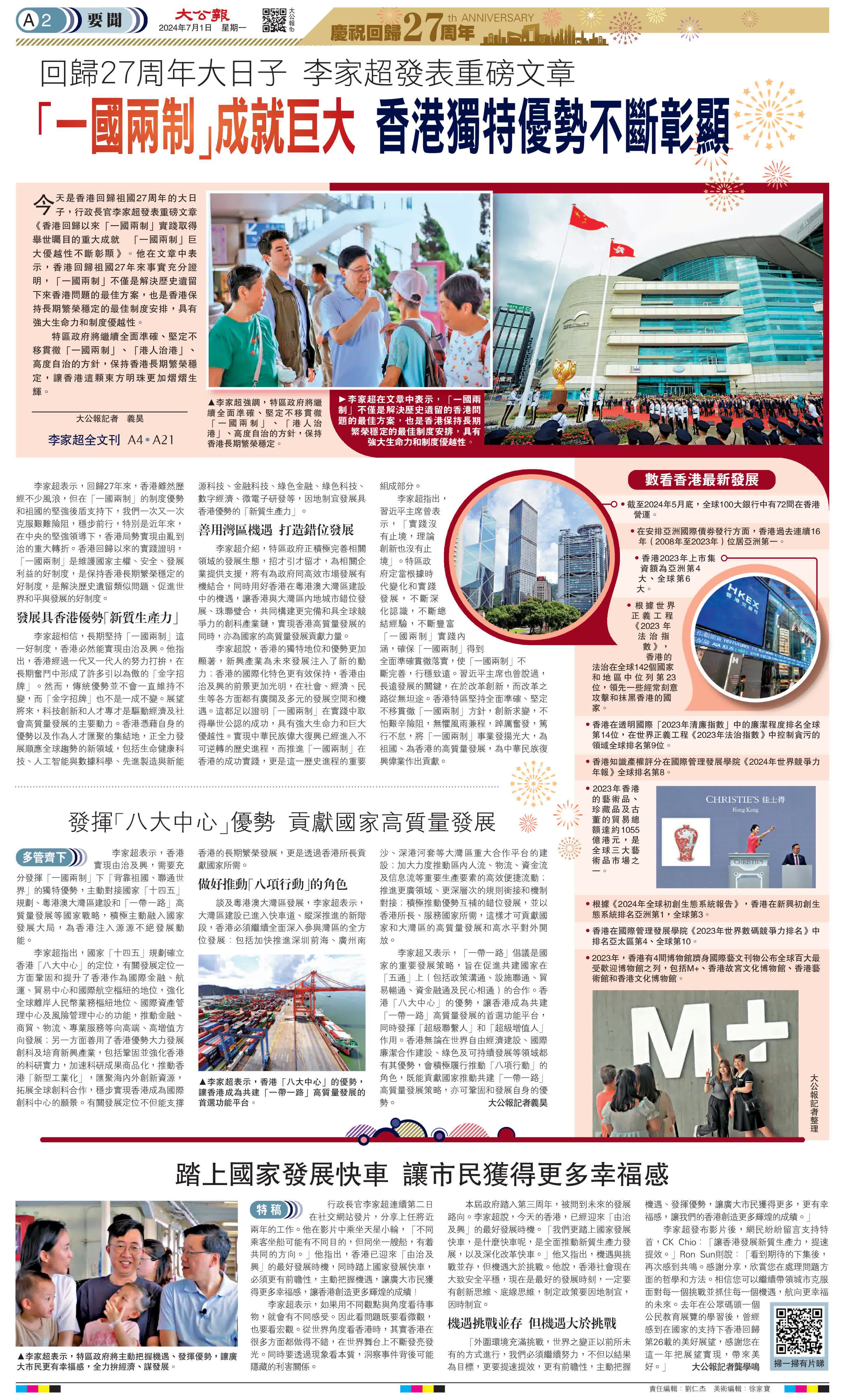 (大公報記者 義昊)今天是香港回歸祖國27周年的大日子,行政長官李家超發表重磅文章《香港回歸以來「一國兩制」實踐取得舉世矚目的重大成就 「一國兩制」巨大優越性不斷彰顯》。他在文章中表示,香港回歸祖國27年來事實充分證明,「一國兩制」不僅是解決歷史遺留下來香港問題的最佳方案,也是香港保持長期繁榮穩定的最佳制度安排,具有強大生命力和制度優越性。