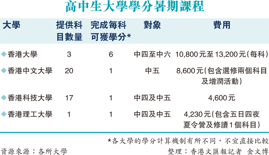 根據香港各所資助大學回覆香港文匯報查詢時提供的資料顯示,香港大學、香港中文大學、香港科技大學及香港理工大學均設有暑期學院(Summer Institute)提供為本地及非本地高中生而設的暑期學分(credit-bearing)課程,內容包括講學授課、小組導修討論、作業、測驗及考試等,學生完成課程後可獲得相應學分,日後入讀相應院校本科課程時,可向所屬院系或相關部門申請承認或轉移該些學分。