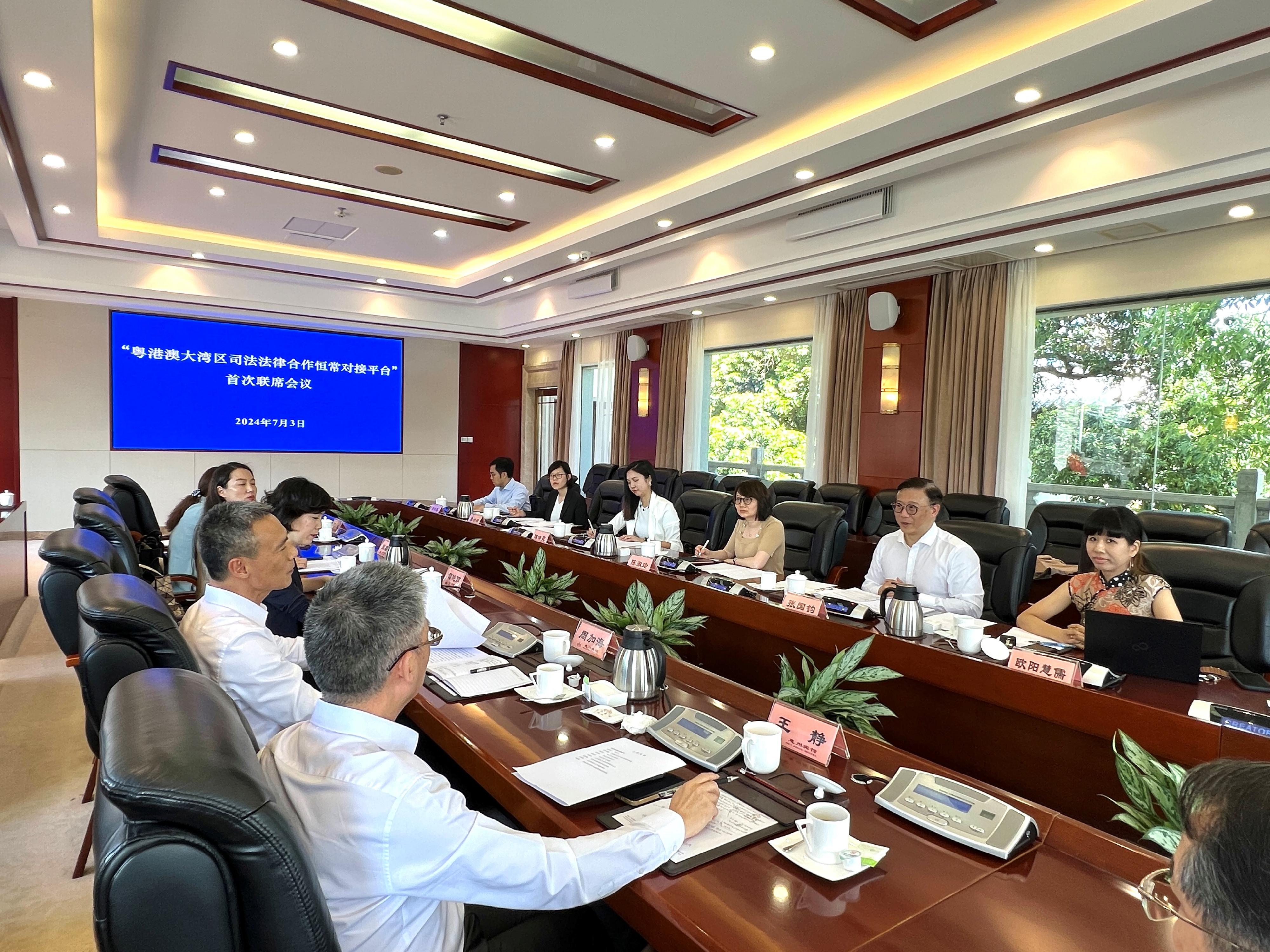 會議由律政司副司長張國鈞與最高人民法院研究室主任周加海共同主持。律政司與最高人民法院於6月中在北京簽署備忘錄,建立粵港澳大灣區司法法律合作恆常對接平台,今日的會議是在平台框架下的首次高層聯席會議。