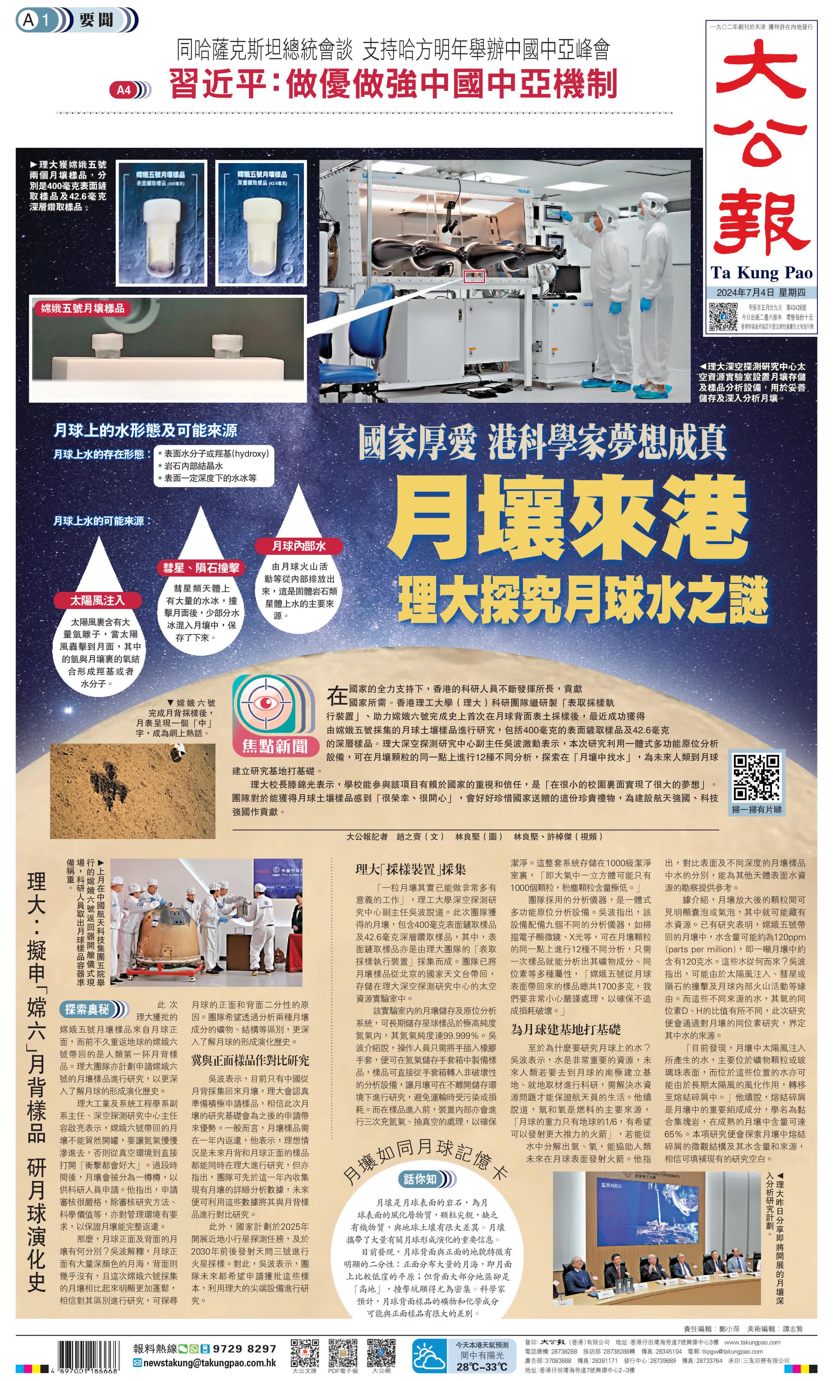 【大公報記者 趙之齊(文) 林良堅(圖) 林良堅、許棹傑(視頻)】在國家的全力支持下,香港的科研人員不斷發揮所長,貢獻國家所需。香港理工大學(理大)科研團隊繼研製「表取採樣執行裝置」、助力嫦娥六號完成史上首次在月球背面表土採樣後,最近成功獲得由嫦娥五號採集的月球土壤樣品進行研究,包括400毫克的表面鏟取樣品及42.6毫克的深層樣品。理大深空探測研究中心副主任吳波激動表示,本次研究利用一體式多功能原位分析設備,可在月壤顆粒的同一點上進行12種不同分析,探索在「月壤中找水」,為未來人類到月球建立研究基地打基礎。