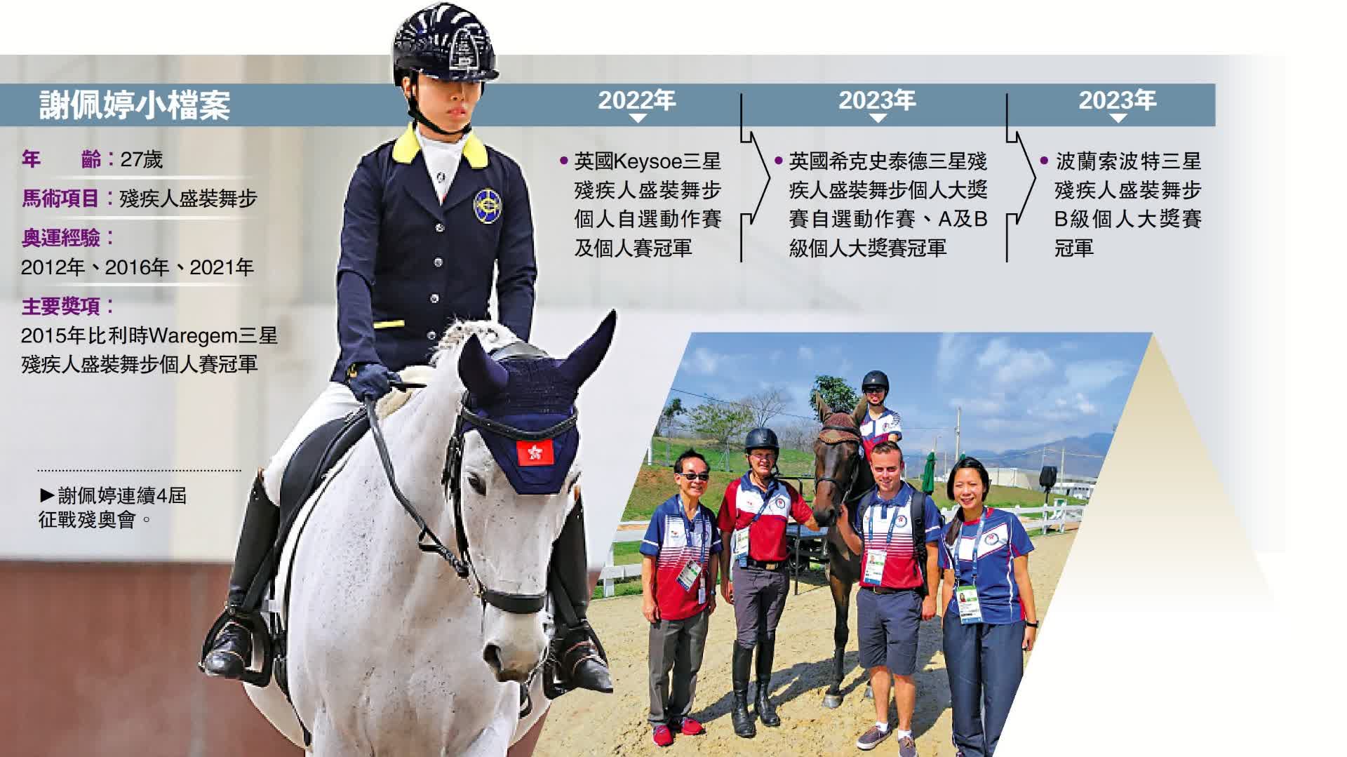 大公報報道,香港賽馬會殘疾人馬術隊成員謝佩婷,獲中國香港殘疾人奧委會及中國香港馬術總會確認,將代表中國香港參與巴黎殘疾人奧運會,出戰馬術盛裝舞步個人項目,是次獲選亦是她個人連續4屆參與殘奧會。
