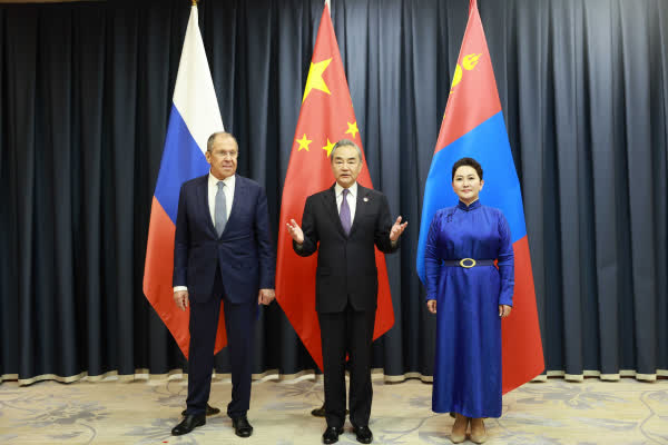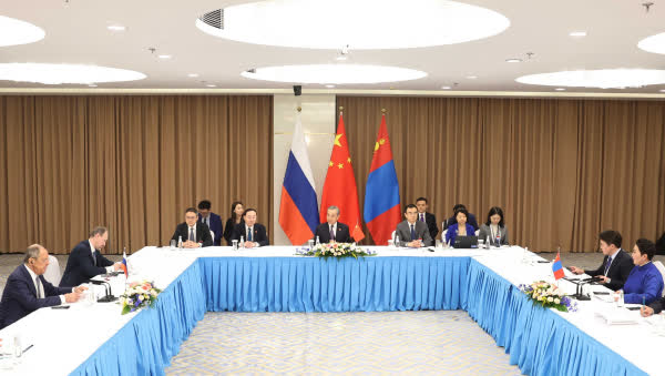 王毅說,中俄蒙是休戚與共的永久鄰邦、命運相連的合作夥伴,三方互利合作具有先天地緣優勢和深厚傳統積澱,符合三國人民的根本利益。近年來,在三國元首戰略引領下,中俄蒙三方務實合作穩步發展,各領域交流對話走向深入,中蒙俄經濟走廊建設扎實推進。今年是中國同俄蒙兩國建交75周年,也是中俄蒙機製成立十周年。中方願同俄方和蒙方一道,恪守合作初心,錨定正確方向,加強團結協作,排除外部干擾,共商互利共贏的有效路徑,共建繁榮穩定的地區格局,共享區域發展的利好成果。