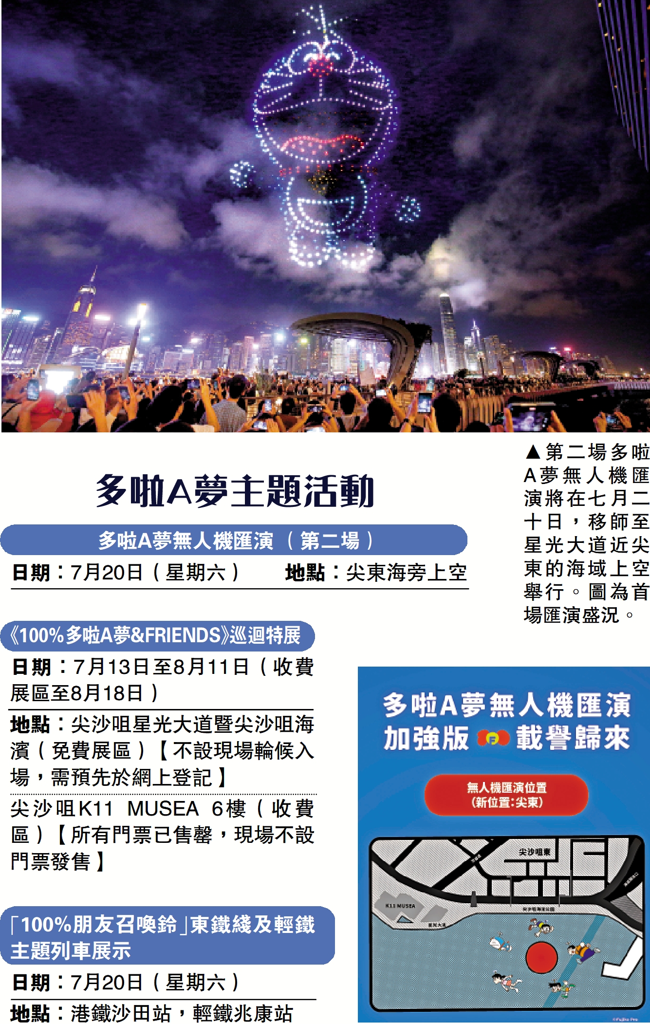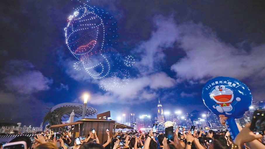 (大公報記者伍軒沛報道)全球首場多啦A夢無人機匯演5月在尖沙咀星光大道對出海面舉行,吸引大批觀眾現場觀看。主辦方昨日宣布,計劃於7月20日再度在維港上空舉辦第二場匯演,並將移師至星光大道近尖東的海域上空舉行。有餐飲業界人士認為,無人機表演能夠為尖東海邊一帶的餐飲業生意起一定提振作用,認為多舉辦盛事,對帶動經濟有益。
