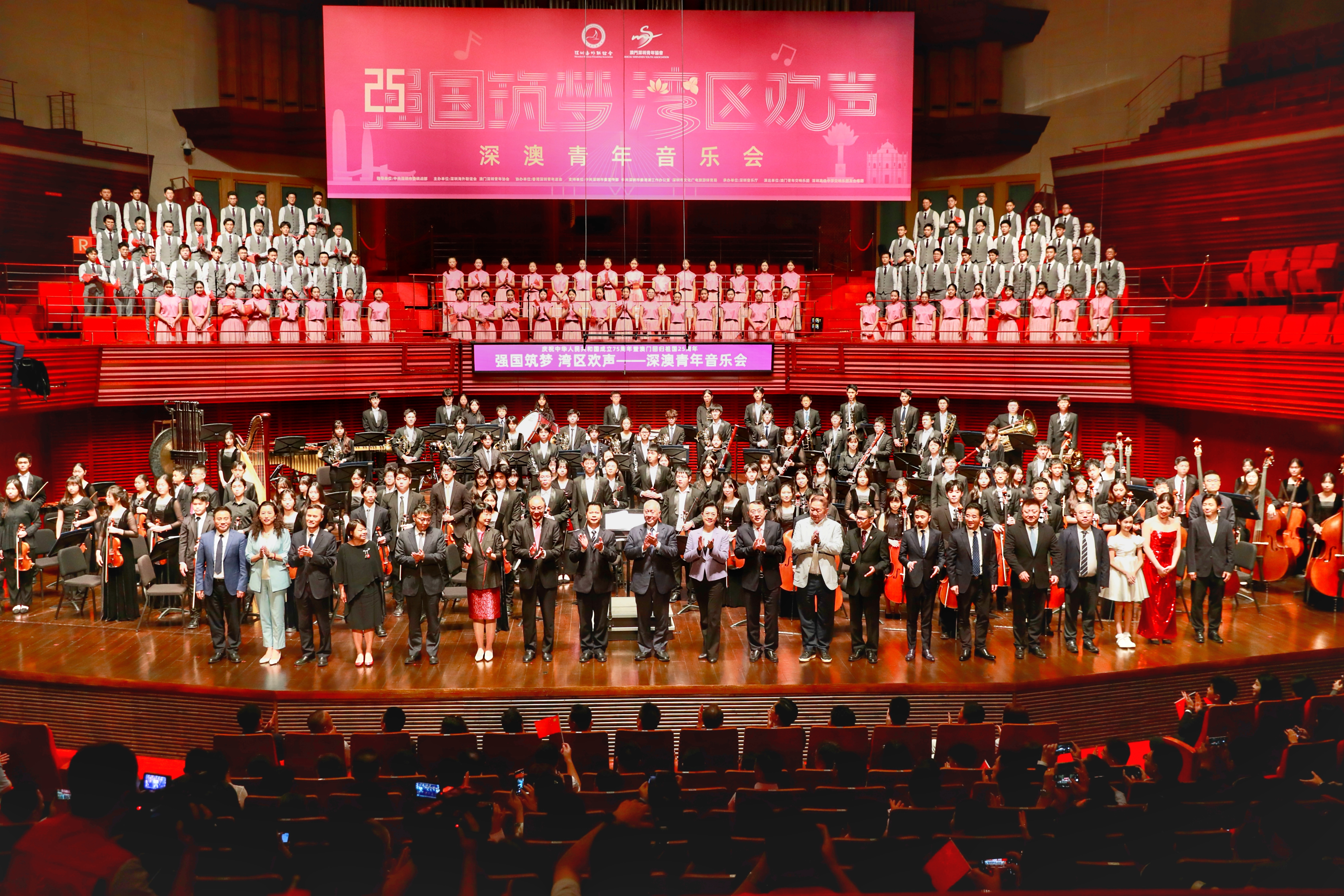 (大公文匯網 記者 李望賢 深圳報道)《節日序曲》、《鴻雁隨想曲》、《黃河鋼琴協奏曲》......5日晚,「強國築夢 灣區歡聲」深澳青年音樂會在深圳音樂廳舉行,澳門青年交響樂團與深圳高級中學交響樂團共同演奏多首經典中外曲目,深圳、香港、澳門等地音樂家聯合演出,共同慶祝中華人民共和國成立七十五周年暨澳門回歸祖國廿五周年。