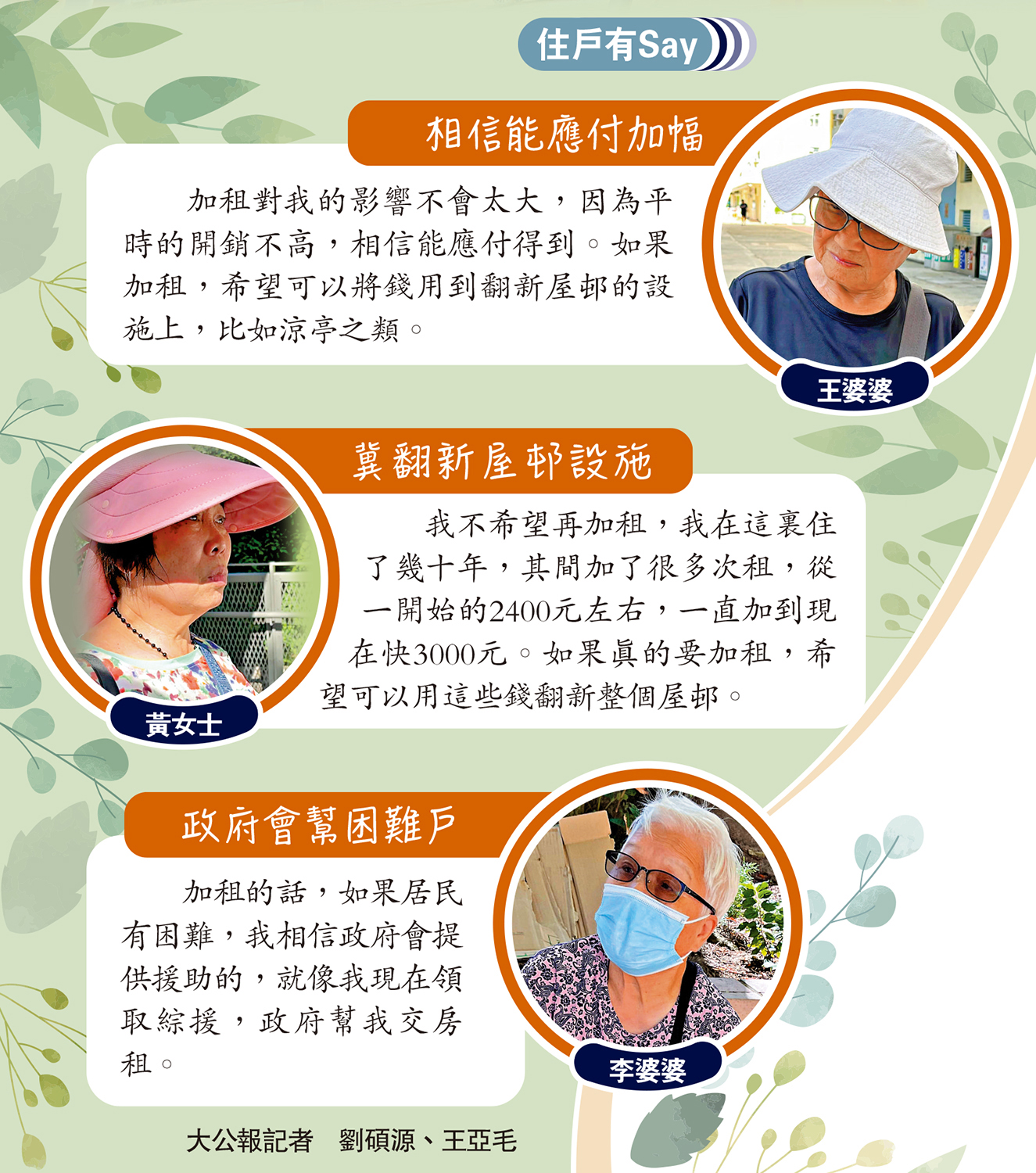 公屋加租理論上10月起生效,若按現時公屋戶平均每月租金近2300元推算,平均每月加租約230元。據估算,現時八成租戶交正常租金,但當中逾六成租戶加租少於250元。至於有特別困難的租戶,包括13%綜援戶,租金由政府繳付,約3%租戶有申領房委會的租金援助,基本不受加租影響;另有4%屬於公屋「富戶」,加租對其影響不大。