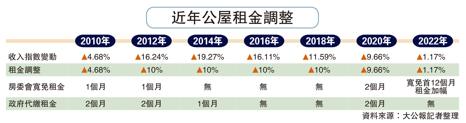 公屋租金調整機制自2008年實施以來,曾先後進行七次租金檢討,其中四次曾觸及加租10%封頂上限。由於《房屋條例》規定房委會須按調整租金機制結果來加租、減租或凍租,沒有彈性,過去房委會曾透過寬免租金平衡加租影響,但隨房委會財政負擔加重,愈來愈多聲音認為房委會應謹慎嚴格控制預算。