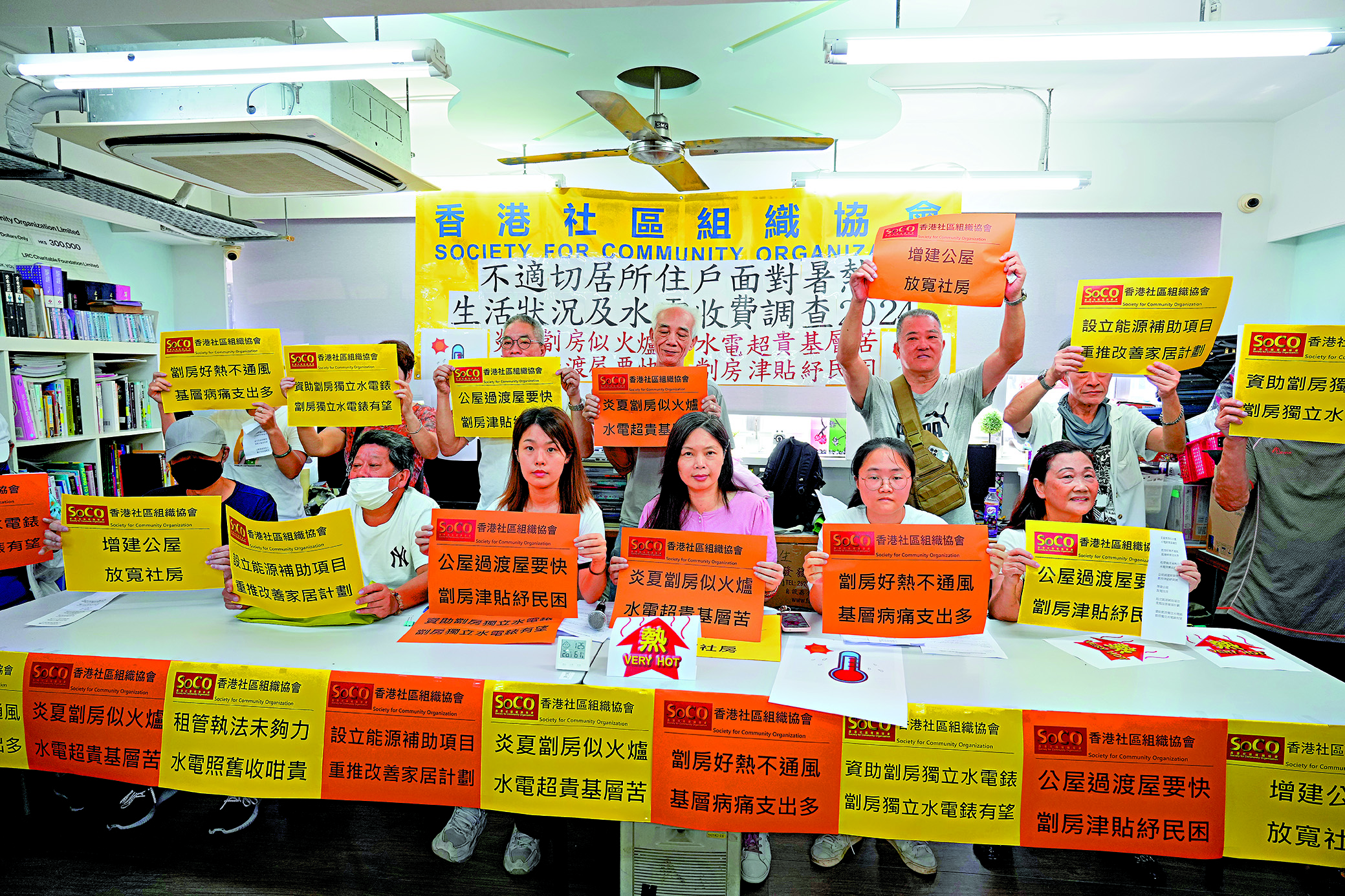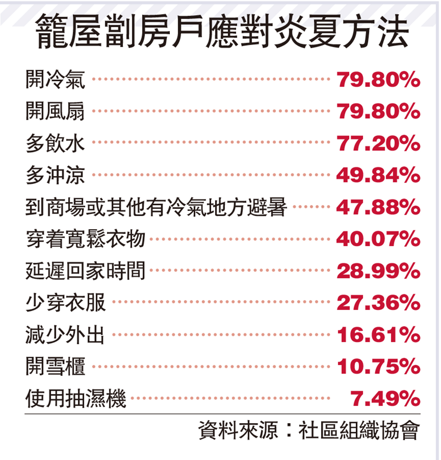 有板間房租戶反映,屋內氣溫高達34度,窗戶因擔心鬆脫長期緊閉,冷氣機滴水嚴重,僅靠一把小風扇消暑,晚上只能靠安眠藥入睡,半夜熱醒要沖涼兩至三次,直言是飽受折磨。社區組織協會建議,政府應增設劏房水電津貼,重啟「為低收入劏房住戶改善家居援助計劃」等。