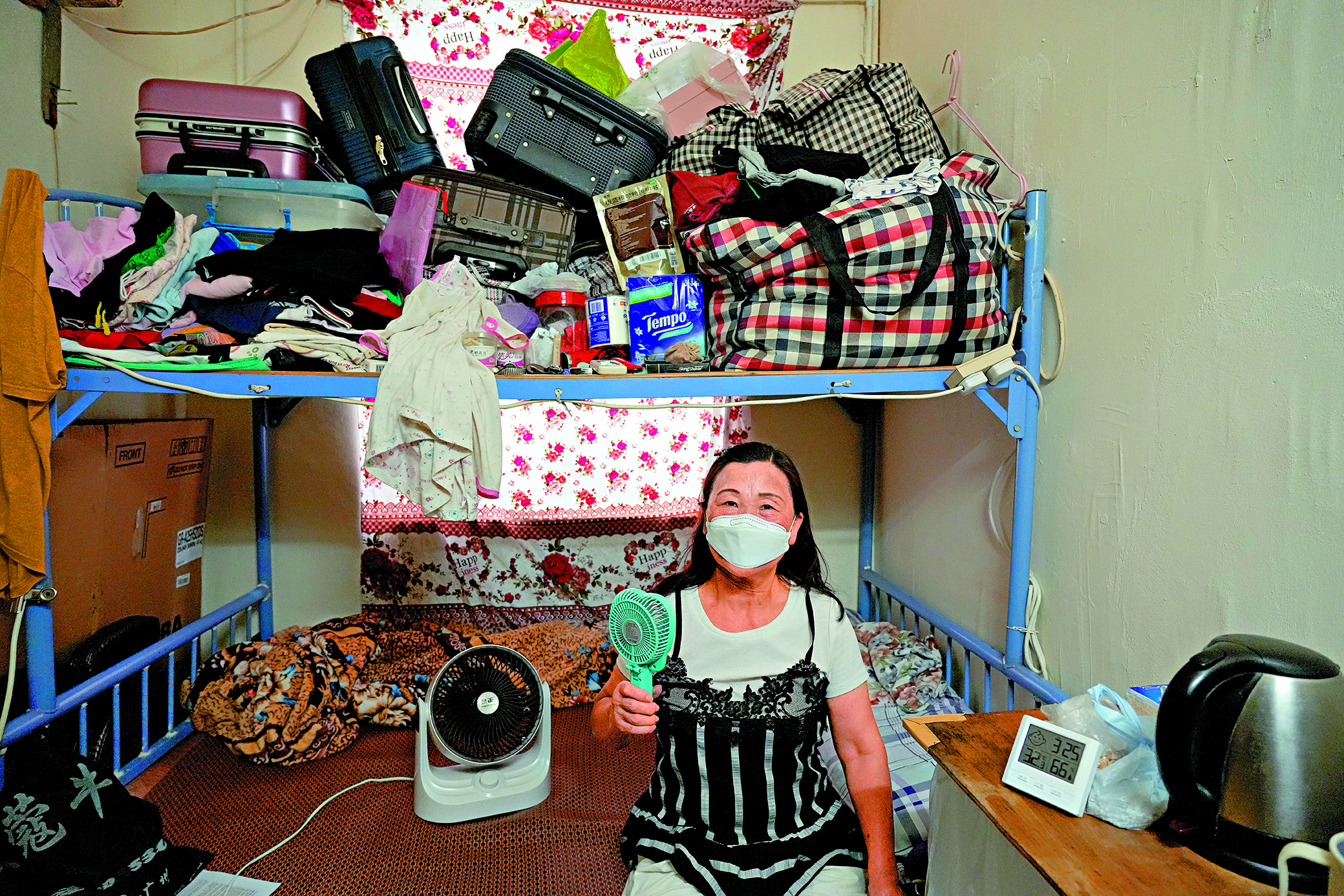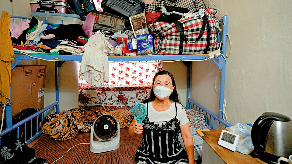 任職清潔工的曾女士月薪10900元,惟租金加上水電每月需約3600元,生活壓力大。曾女士說,雖然每位租戶也有獨立的電錶,但業主收取每度電1.7元,還要攤分公用地方的電費,每月要交逾300元電費。為省電,曾女士每晚只能靠風扇微弱的風,度過漫漫長夜,「半夜經常熱醒,要去沖涼兩至三次,又因同層其他房間人多嘈雜,每晚只能食安眠藥入睡」,直言是「飽受折磨」。